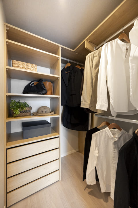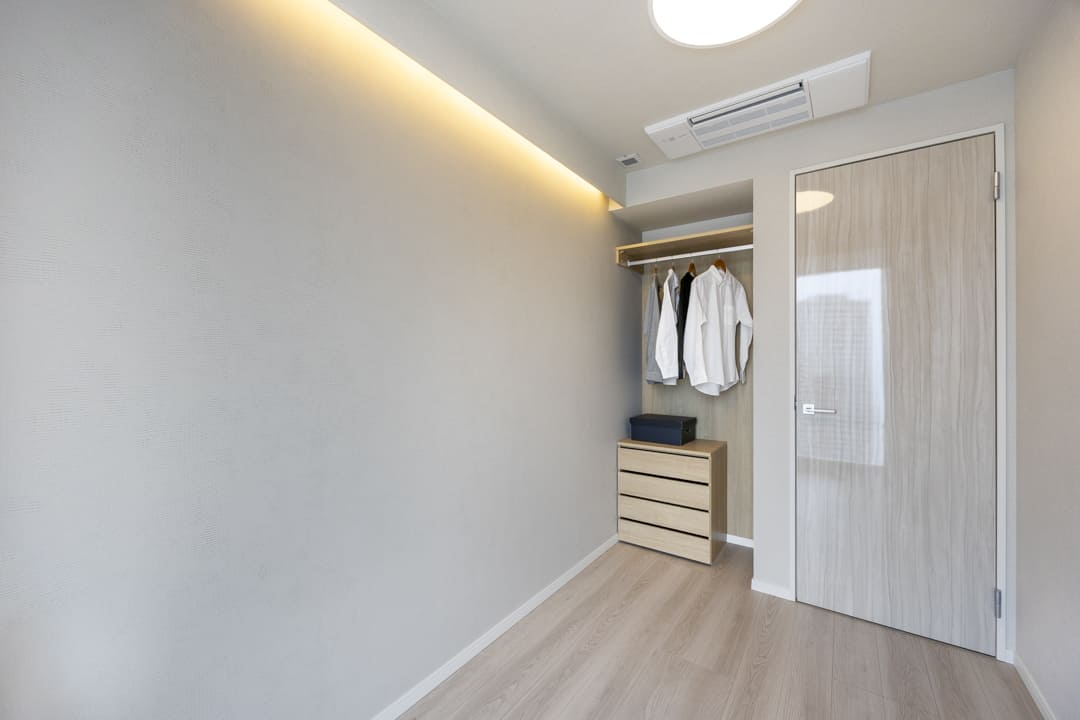 約6.8帖の洋室1は、ゆとりがあって主寝室に良さそうなお部屋です。間接照明も設置されていて癒しの空間。窓からはバルコニーにアクセスできます。また、奥行きがあるウォークインクローゼット付き。洋服や小物などたくさんの荷物を収納することが可能です。