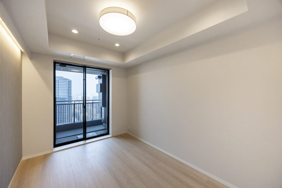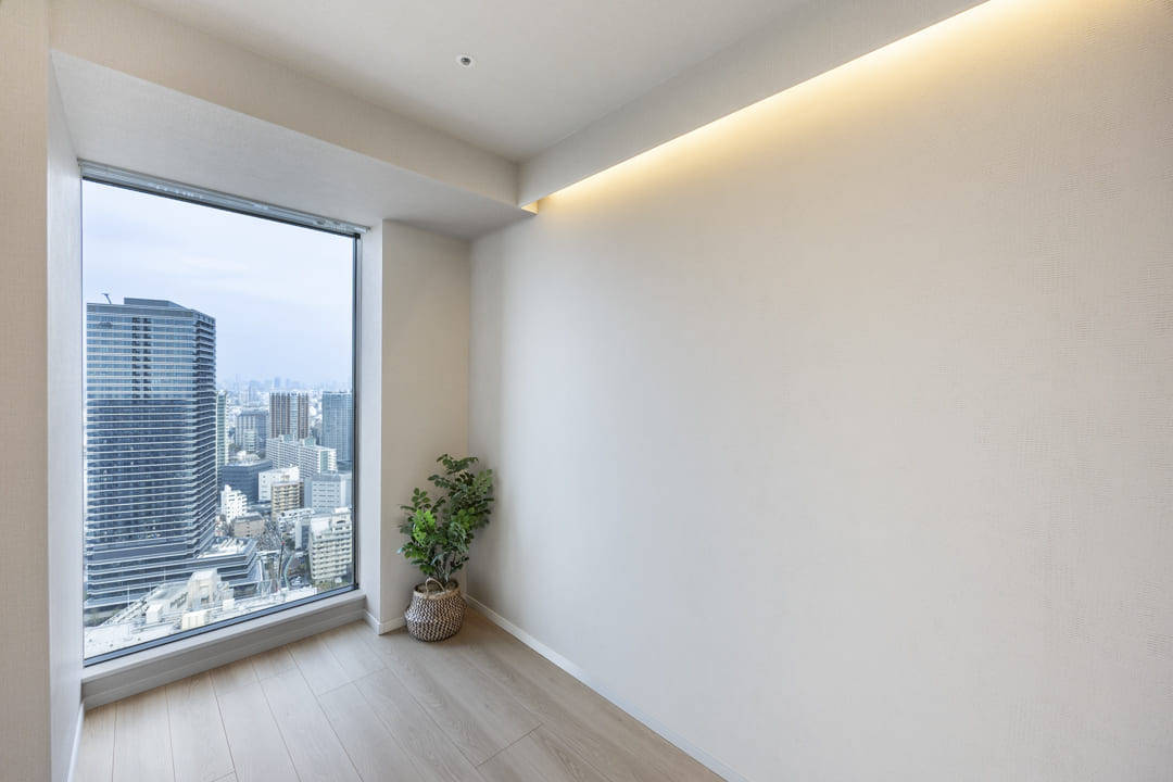 約4.2帖の洋室2は、子ども部屋や書斎など色々な使い方ができるお部屋です。オープンクローゼット付きのため、空間に圧迫感を与えずに収納スペースを確保することができます。また、大きな窓からは都心的な眺望を楽しめます。
