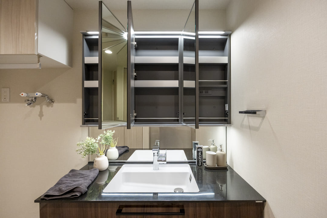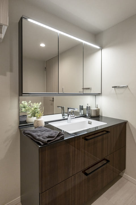 ダークカラーで高級感のある洗面化粧台です。三面鏡の中には化粧品などを収納できて使い勝手良好。洗面ボウルとカウンターの継ぎ目がないので、お手入れも簡単です。また、背面側にはリネン庫が造られており、ごちゃごちゃしがちな洗面まわりをきちんと整頓させるできます。