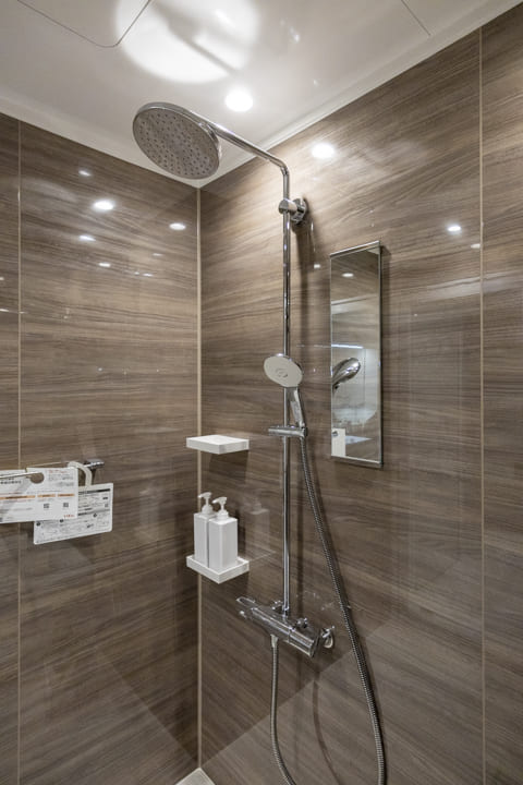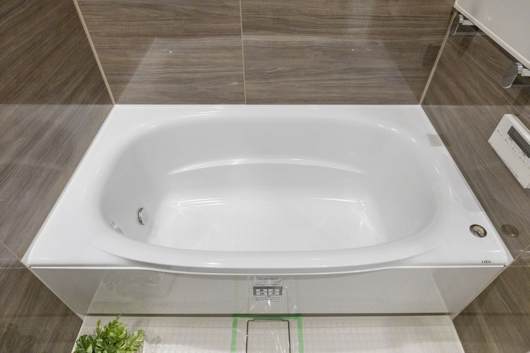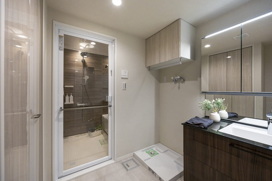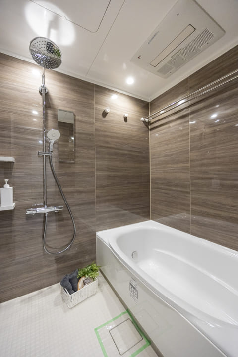 ブラウンの壁パネルが落ち着いた雰囲気を演出してくれている浴室です。お風呂にゆっくり浸かるのが好きという方に嬉しい追い焚き機能を搭載。家族の入浴時間がずれてしまっても安心です。浴室乾燥機には暖房・乾燥・換気・涼風の機能がついており、一年中快適に過ごすことができます。また、オーバーヘッドシャワーが付いているのでたっぷりと全身で湯を浴びることができます。リラックス効果や保温効果もあって◎。