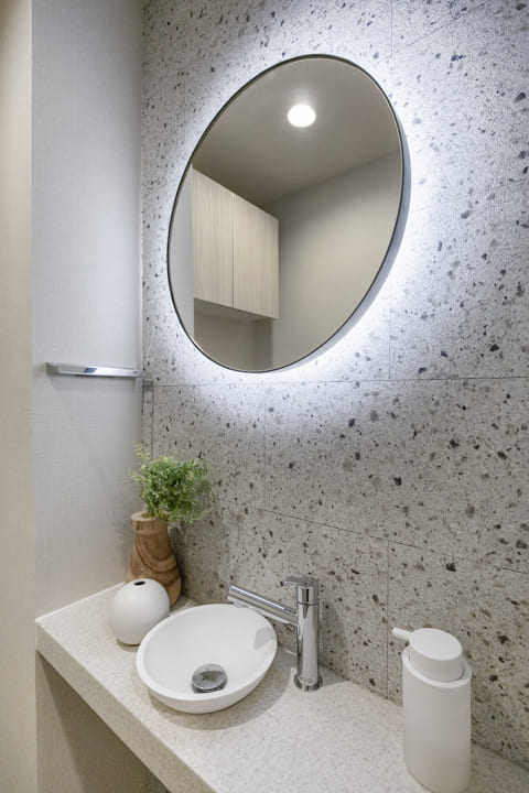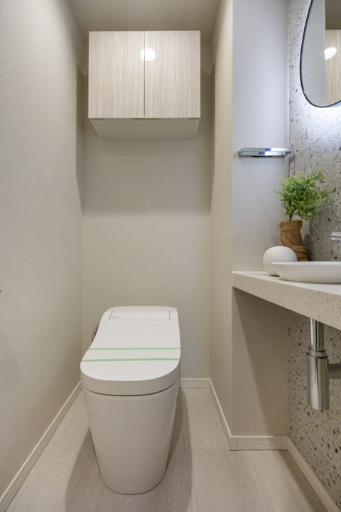 ウォシュレット一体型のトイレです。タンクレスタイプなのですっきりとした印象に。また、別途で手洗い器と鏡が造られているので、その場でサッと身だしなみを整えることができます。丸型のミラーはおしゃれで◎。上部には吊戸棚が設置されていて、収納スペースもありますよ。