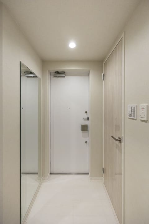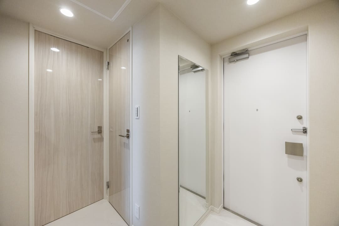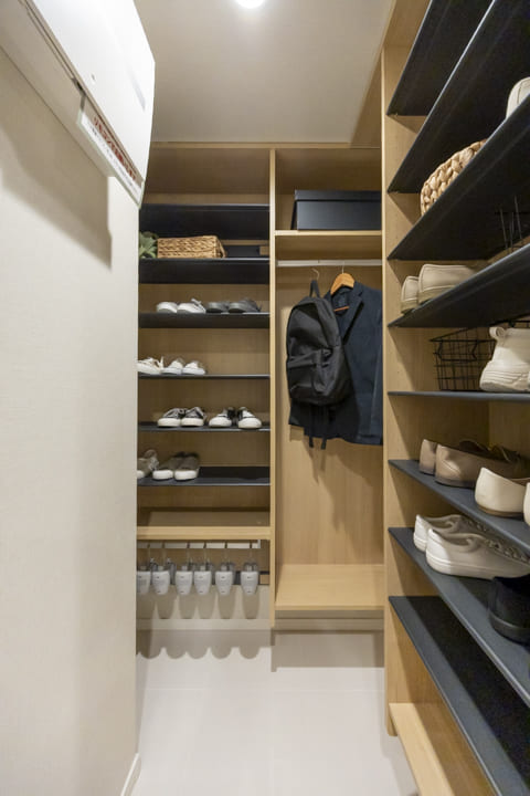 ベージュトーンでまとめられた柔らかな印象の玄関です。入って左側にはシューズインクローゼットがあり、中には靴やアウターなども収納することができます。また、反対側の壁面には鏡が設置されているので、出かける際に全身のコーディネートをチェックできて便利です。