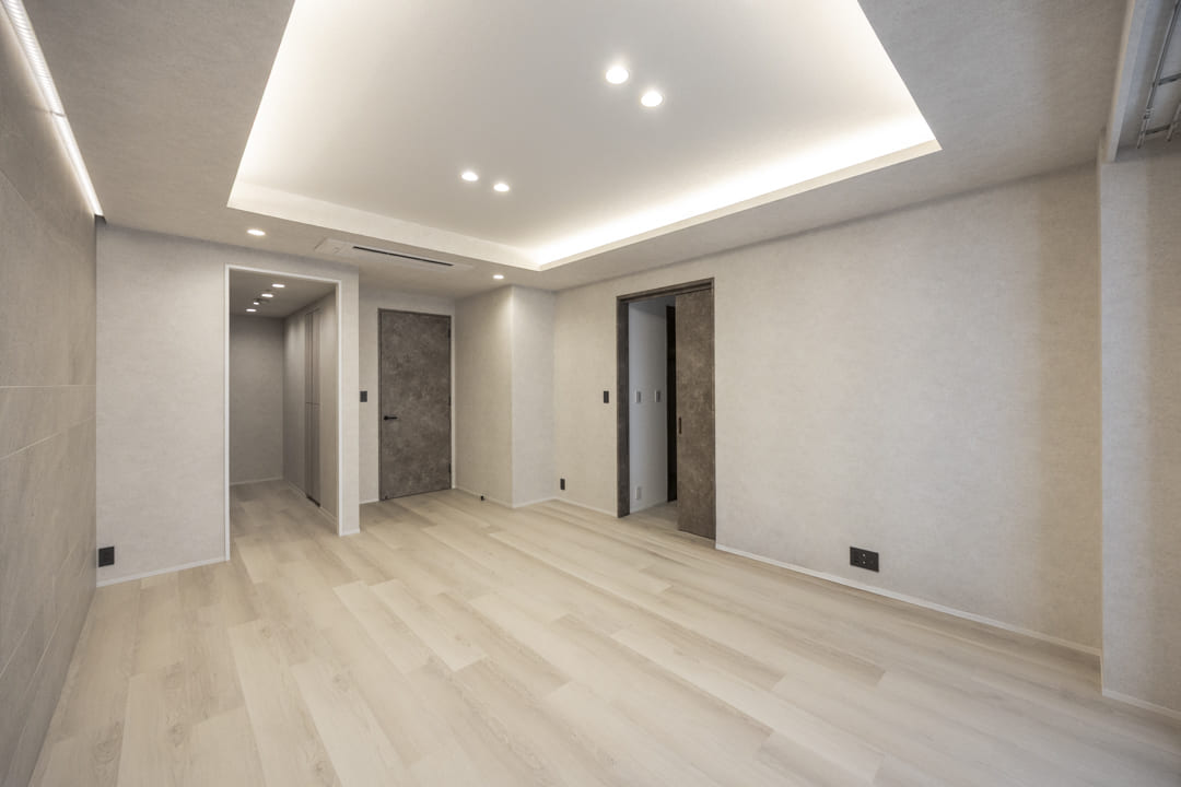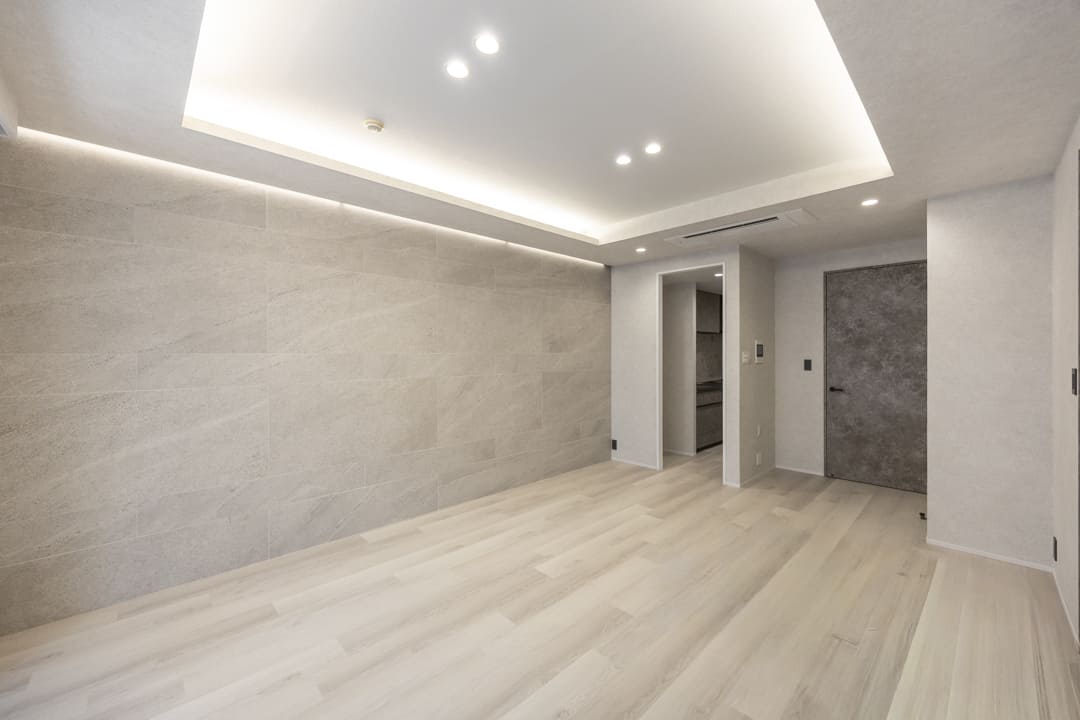 約15.6帖の広々としたリビングダイニングキッチンです。壁面には石目調のアクセントウォール、折り上げ天井には間接照明があしらわれていて上品な雰囲気が漂っています。エアコンは埋め込み式のためインテリアの邪魔をしないのも◎。