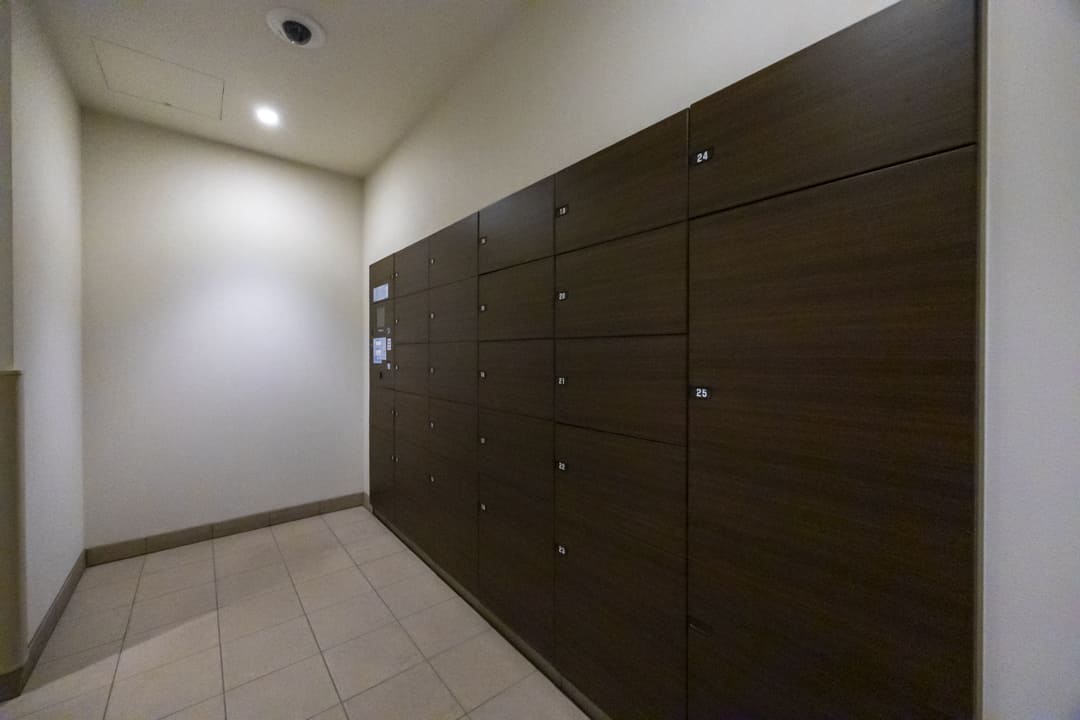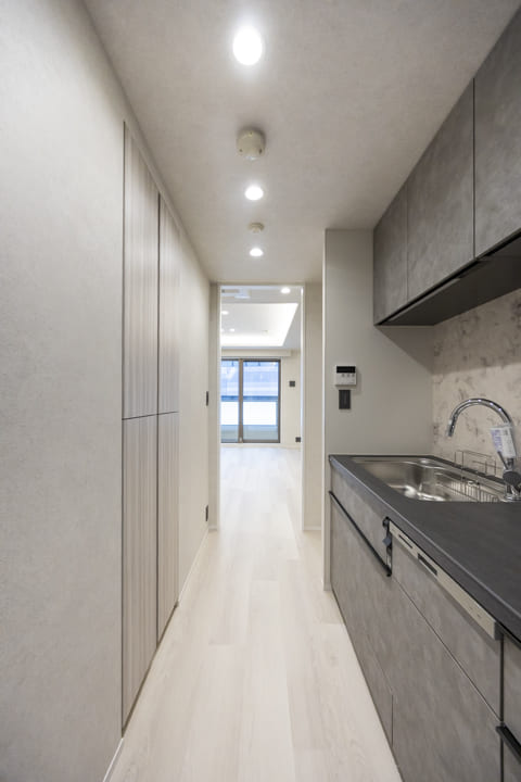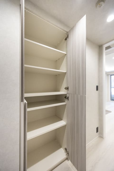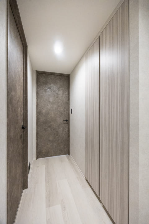 高級感のある漂う玄関にはシューズインクローゼットが造られています。靴を収納できるだけでなく、ベビーカーやスーツケースなどの大きめの荷物も収納できそうで便利。また、廊下にも収納棚が設置されています。