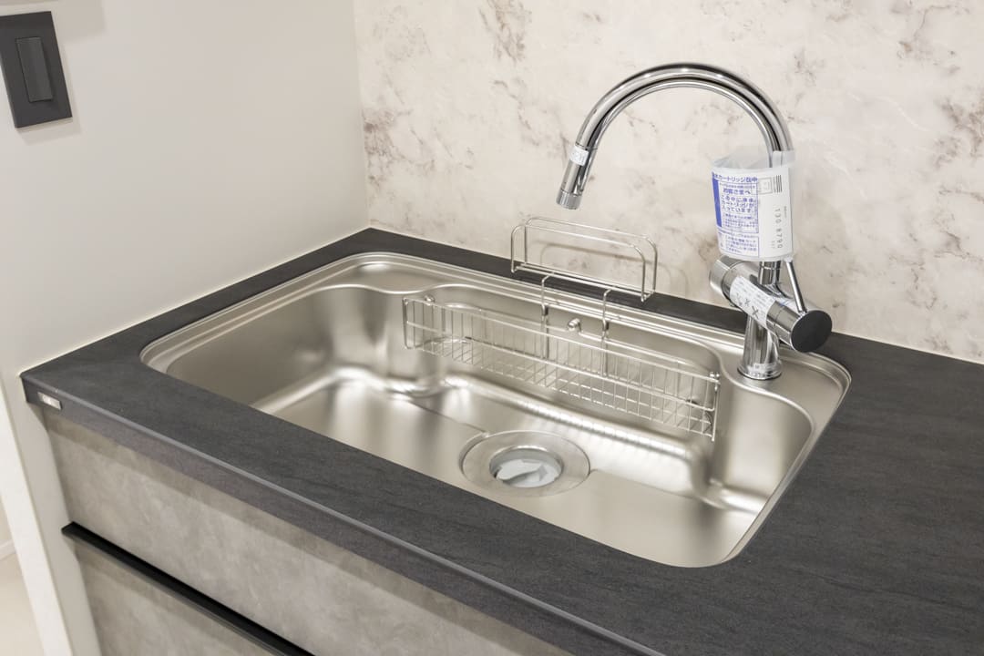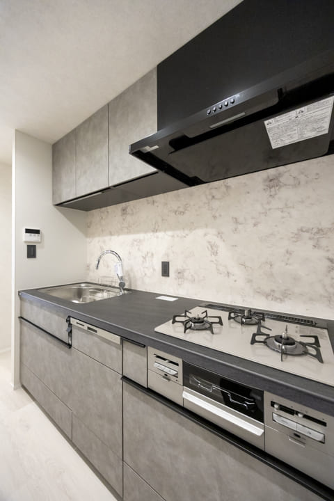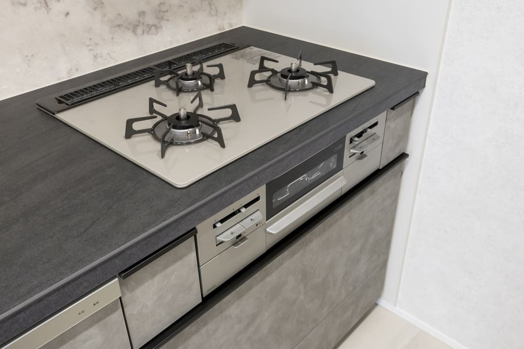 3口コンロ、グリル、ディスポーザー、食洗機付きと設備面も充実しています。作業スペースにはコンセントがあるので、ミキサーなどのキッチン家電も使いやすそうです。