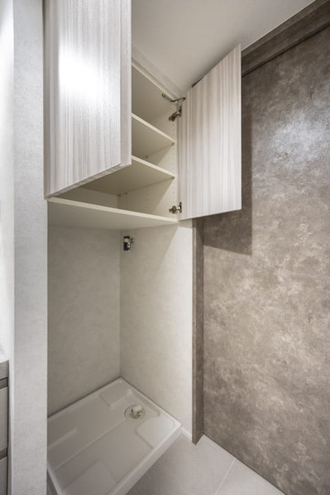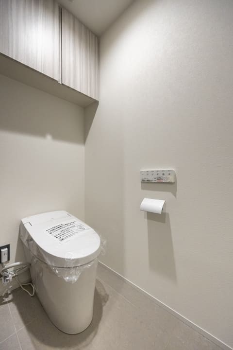 ウォシュレット一体型のトイレです。タンクレスタイプなのですっきりとした印象に。上部には吊戸棚が設置されていて、トイレットペーパーや掃除用品などを収納することができます。