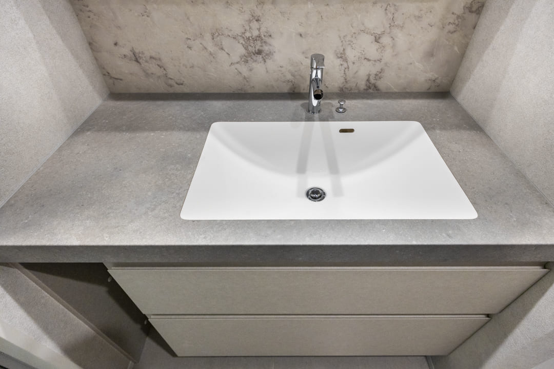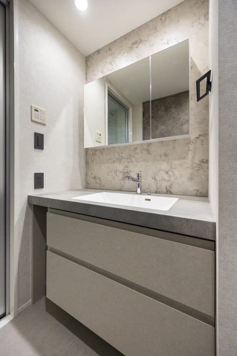 石目調の壁面が上質な雰囲気を醸し出している洗面化粧台です。三面鏡の中には化粧品などを収納できて使い勝手が良好。洗面ボウルとカウンターには継ぎ目がないため、お手入れも簡単です。