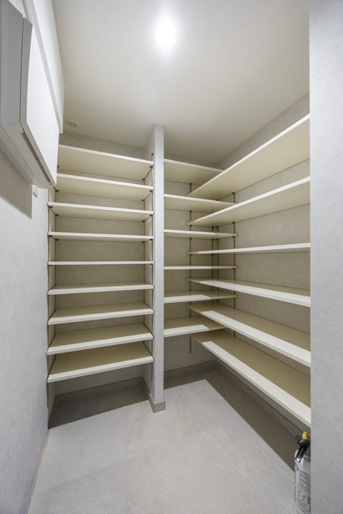 背面側にはパントリーが造られています。調味料や保存食品などもすっきりと収納することができそうですよ。
