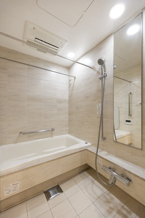 ベージュトーンでまとめられた落ち着いた雰囲気を演出してくれている浴室です。お風呂にゆっくり浸かるのが好きという方に嬉しい追い焚き機能を搭載。浴室乾燥機には暖房・乾燥・換気・涼風の機能がついており、一年中快適に過ごすことができます。