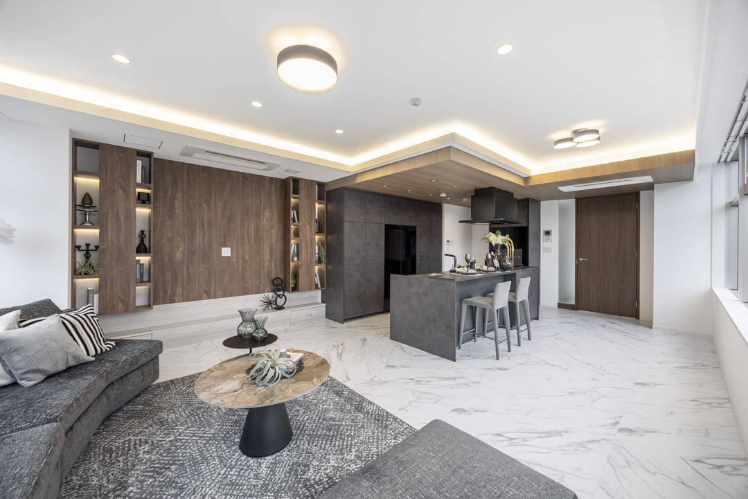壁面には、お気に入りの小物を美しく飾ることができる造作のテレビボードを設置。テレビは壁掛け仕様に対応しており、空間全体がすっきりと整います。さらに、やわらかな間接照明が空間に奥行きと落ち着きをもたらし、心地よい時間を演出します。