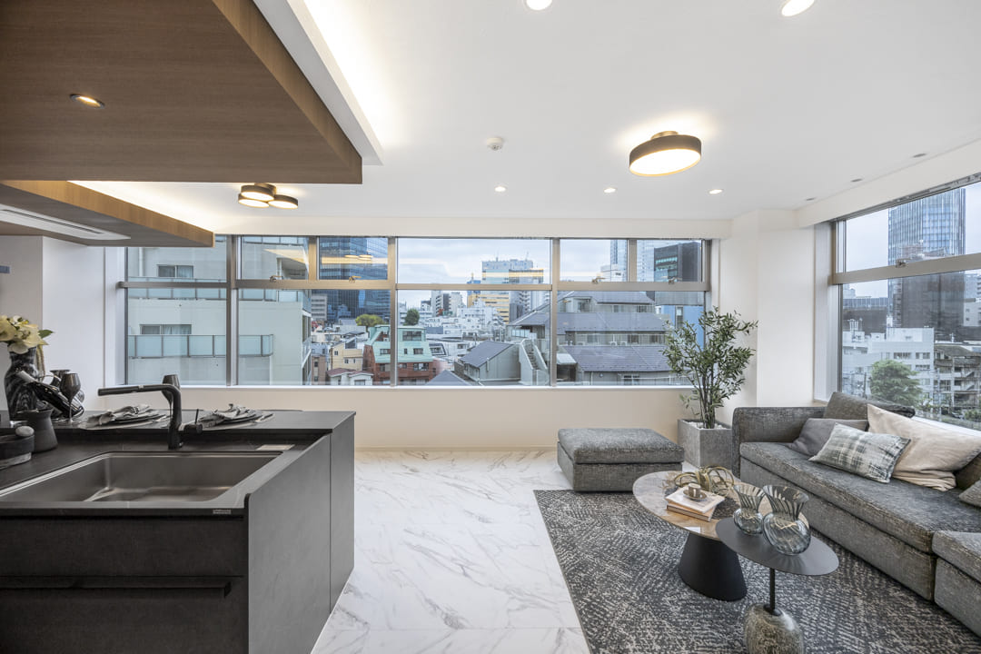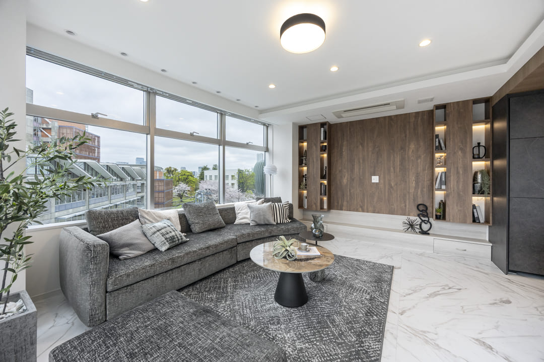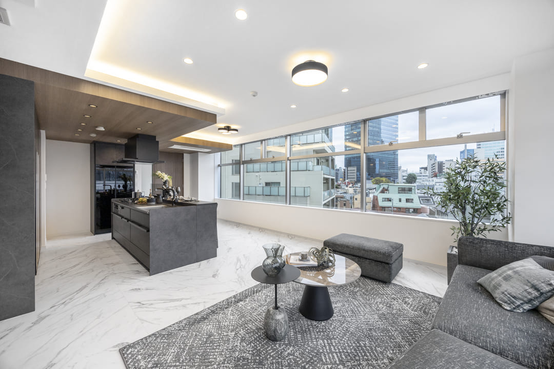 約19.3帖の広々としたリビングダイニングキッチン。二面に窓が配され、室内には明るさと開放感が広がります。北西側の窓先には国立美術館の緑が広がり、季節の移ろいを身近に感じられるロケーションです。さらに、天井に施された間接照明が空間に陰影をもたらし、洗練された雰囲気を演出しています。