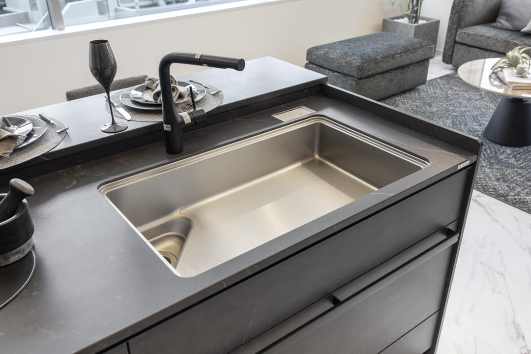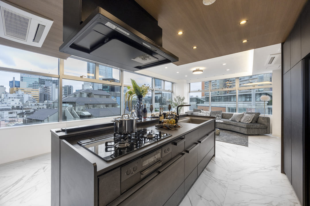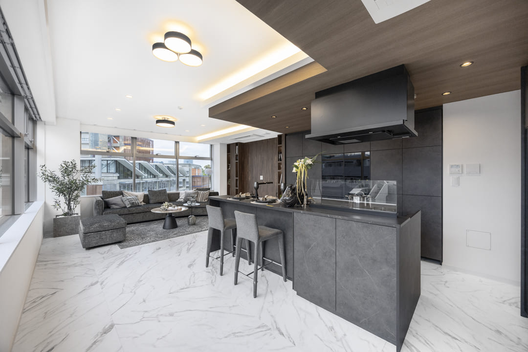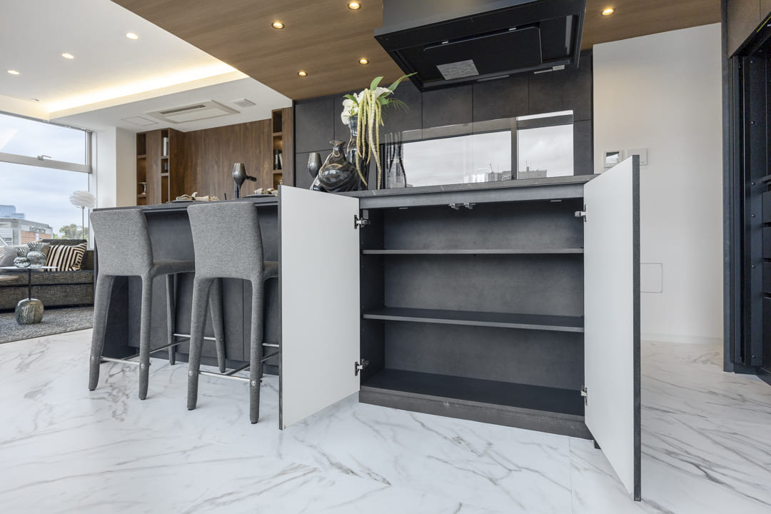 キッチンは存在感のあるアイランドキッチンです。リビングダイニングを見渡しながら料理することができるのでコミュニケーションもとりやすくなっています。さらに、両側から出入りすることができる動線になっているので使い勝手も良好です。ダークカラーで統一されており、空間全体を引き締め、天井のウッドパネルとの組み合わせにより、シャープさの中にも温かみが感じられるバランスの良い仕上がりとなっています。