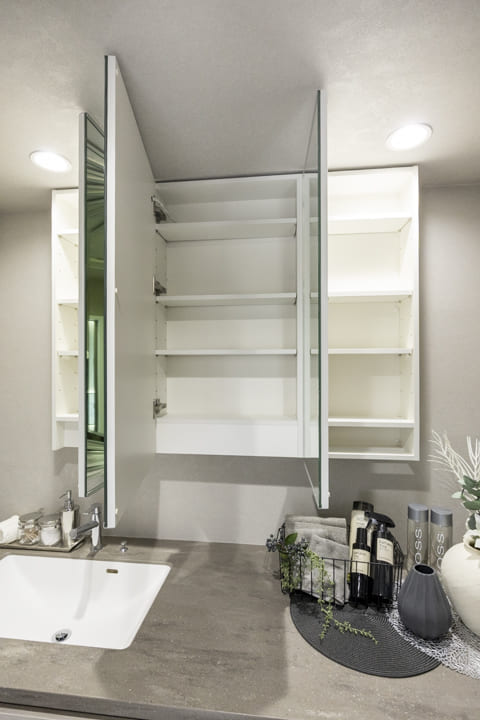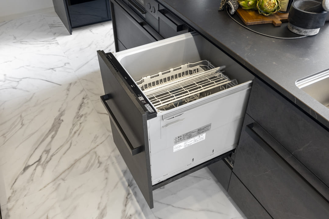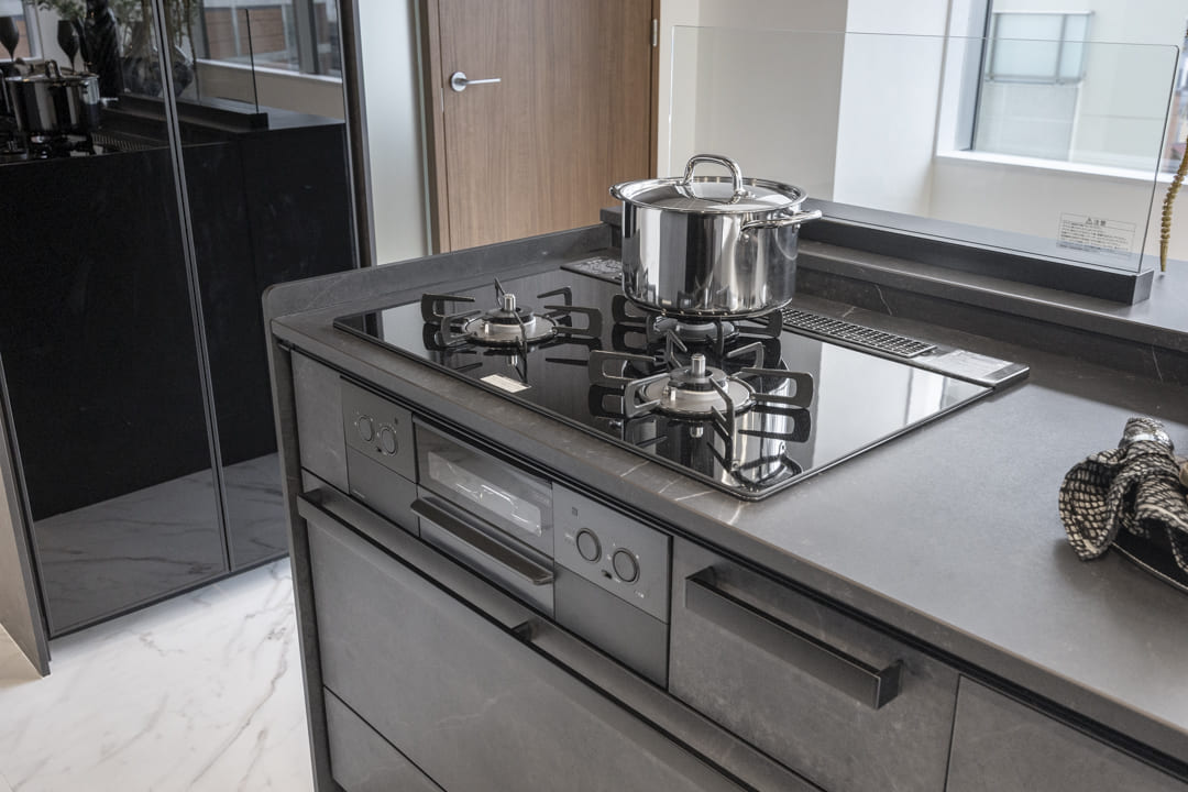 3口コンロ、グリル、ディスポーザー、食洗機付きと設備面も充実しています。また、カウンターにはスツールを設置できるため、軽食や会話を楽しむ場としても活用可能。料理をしながら自然とコミュニケーションが生まれる、暮らしの中心となるキッチンです。小物が収納できるようになっているのも◎。