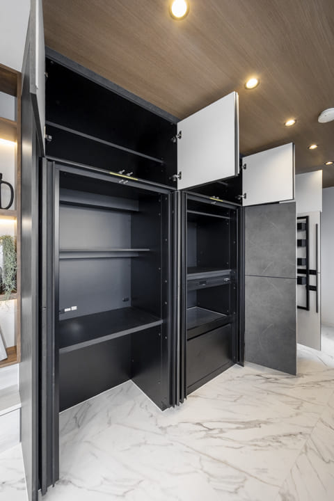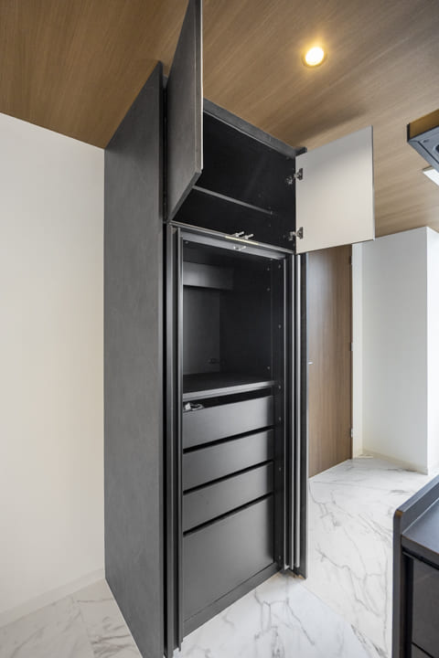 キッチンの背面や側面には、カップボードや収納棚が造り付けられています。電子レンジや炊飯器などの家電をすっきりと配置できるほか、吊戸棚や引き出しを活用して調味料や保存食品も整理しやすい設計です。さらに、ゴミ箱を収められるスペースも確保されており、扉で目隠しできるため、空間の印象を損なわずに整ったキッチンまわりを保てます。