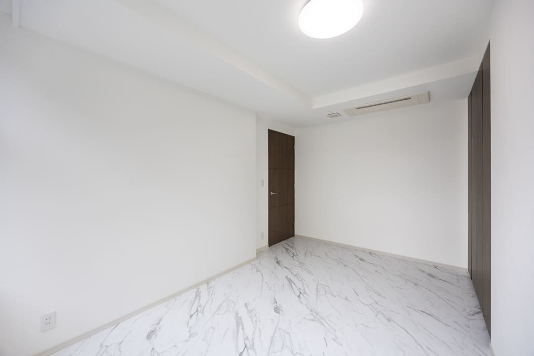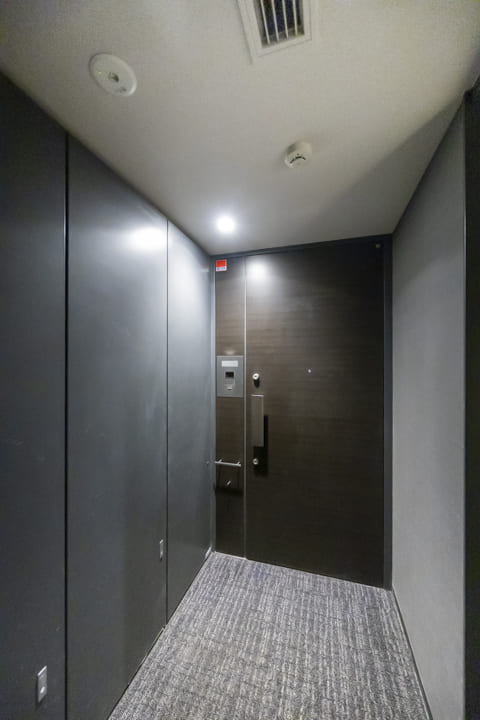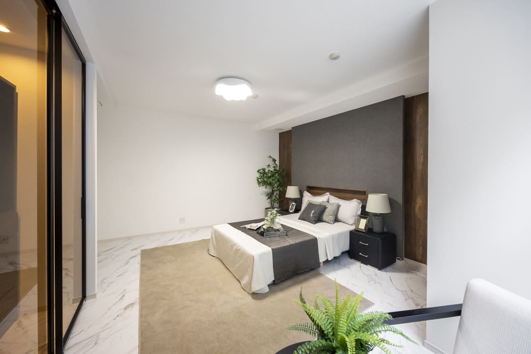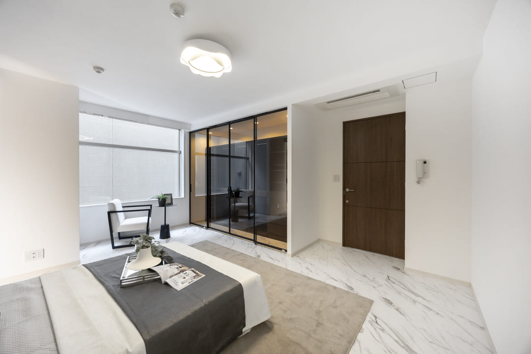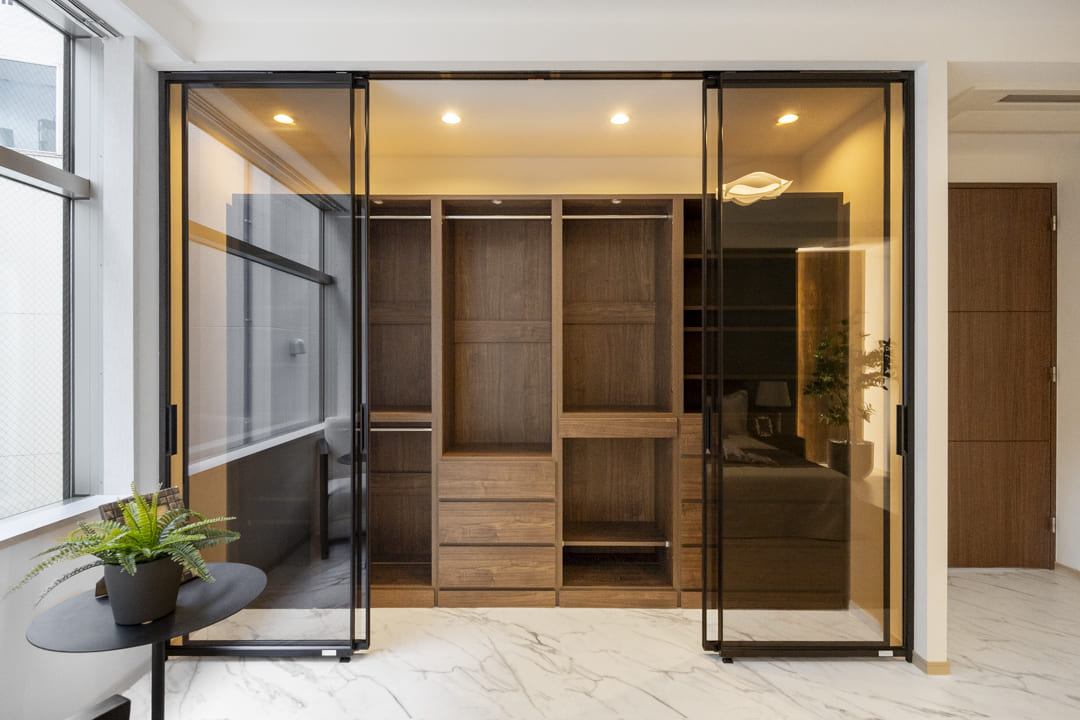 約12.3帖の広々とした洋室1です。ダークカラーのアクセントウォール、ウッドパネルと間接照明の組み合わせが、空間に立体感をもたらし、落ち着いた雰囲気を演出しています。ホテルライクな設えで、日々の休息時間を心地よく過ごせそうです。また、透け感のある扉で仕切られた収納スペースもポイント。内部には棚や引き出しが備えられており、衣類や小物を整理しやすい設計です。視覚的な抜け感を保ちながら、空間をすっきりと整えられます。