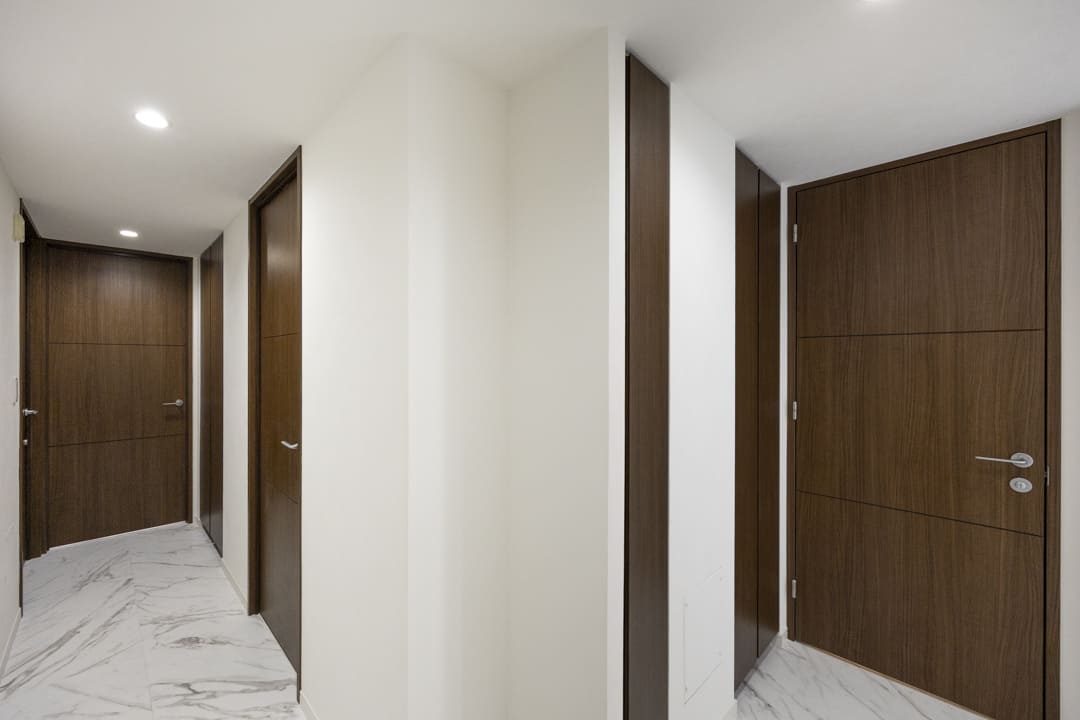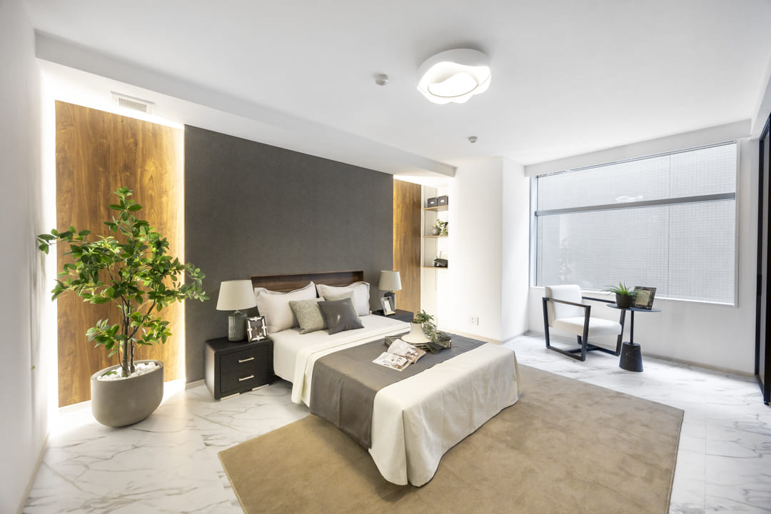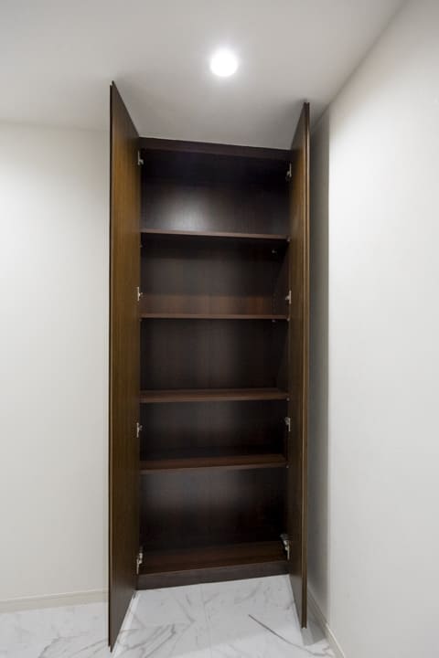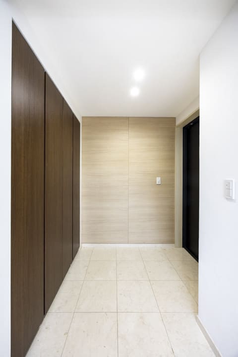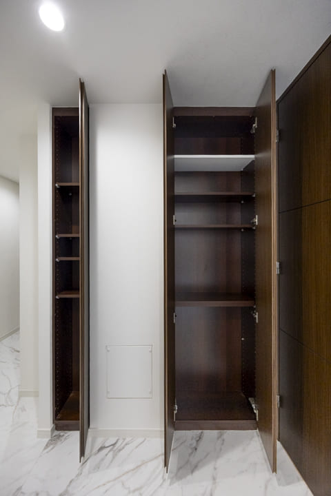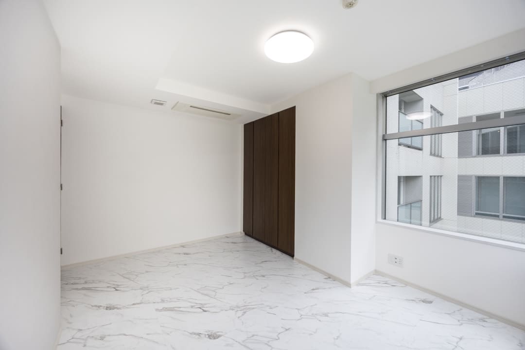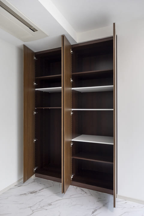 約12.3帖の広々とした洋室1です。ダークカラーのアクセントウォール、ウッドパネルと間接照明の組み合わせが、空間に立体感をもたらし、落ち着いた雰囲気を演出しています。ホテルライクな設えで、日々の休息時間を心地よく過ごせそうです。また、透け感のある扉で仕切られた収納スペースもポイント。内部には棚や引き出しが備えられており、衣類や小物を整理しやすい設計です。視覚的な抜け感を保ちながら、空間をすっきりと整えられます。