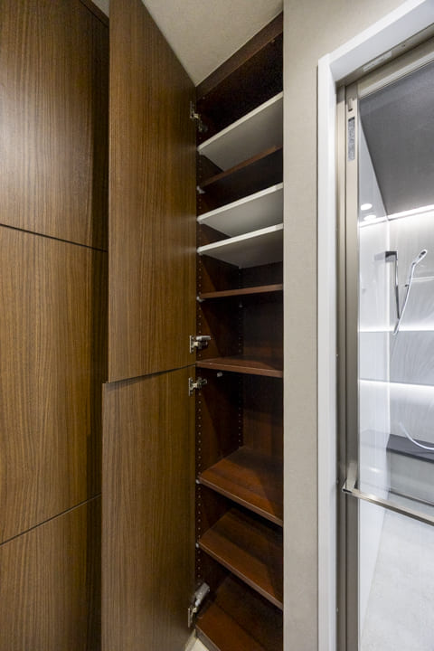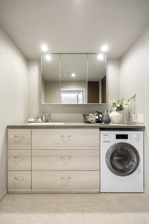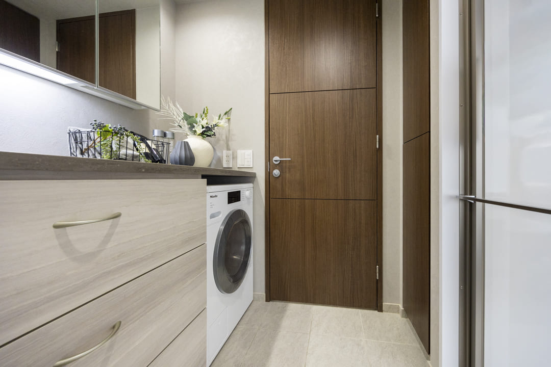 上質な雰囲気を醸し出している洗面化粧台です。広めのカウンターが特徴的で、身支度もしやすそう。三面鏡の中には化粧品などを収納できて使い勝手も良好です。また、ビルトイン洗濯乾燥機が設置されています。Miele(ミーレ)製のためアプリでコントロールができますよ。デリケートやデニム、シャツ用など様々なモードがあり、大切な洋服をケアしながら洗濯が可能です。また、背面側にはリネン庫が造られているので、ごちゃごちゃしがちな洗面まわりをきちんと整頓させることができます。