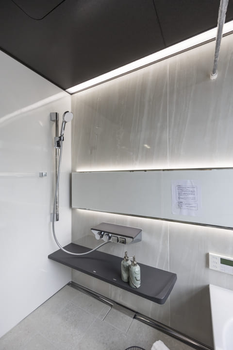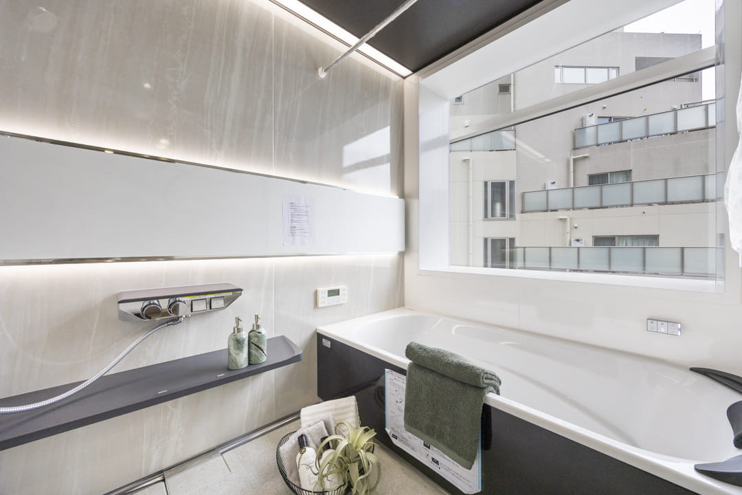 大きな窓が印象的なバスルームです。壁面は鏡面仕上げで高級感があり、優雅な雰囲気。お風呂にゆっくり浸かるのが好きという方に嬉しい追い焚き機能を搭載。家族の入浴時間がずれてしまっても安心です。浴室乾燥機には暖房・乾燥・換気・涼風の機能がついており、一年中快適に過ごすことができます。