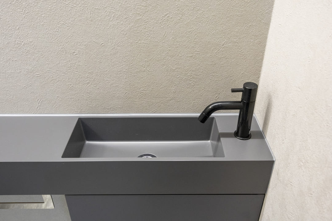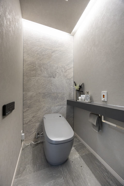 石目調でまとめられたスタイリッシュなレストルーム。ウォシュレット一体型で、タンクレスタイプなのですっきりとした印象です。また、別途で手洗い器が造られているので、すぐに手を洗うことができて衛生的。カウンタースペースにはアロマなどを置くこともできます。