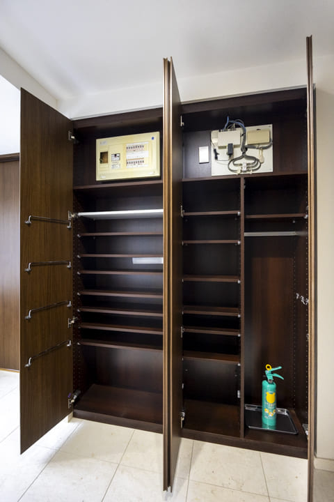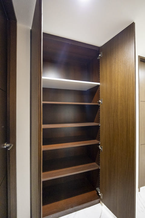 荷物を持っていても出入りがしやすそうな、ゆったりとした玄関です。入って正面には高さのあるシューズボックスが備え付けられていて収納力◎。また、照明には人感センサーが付いているので、帰宅時に両手が塞がっていても安心です。消し忘れも防止できて節電にもなります。