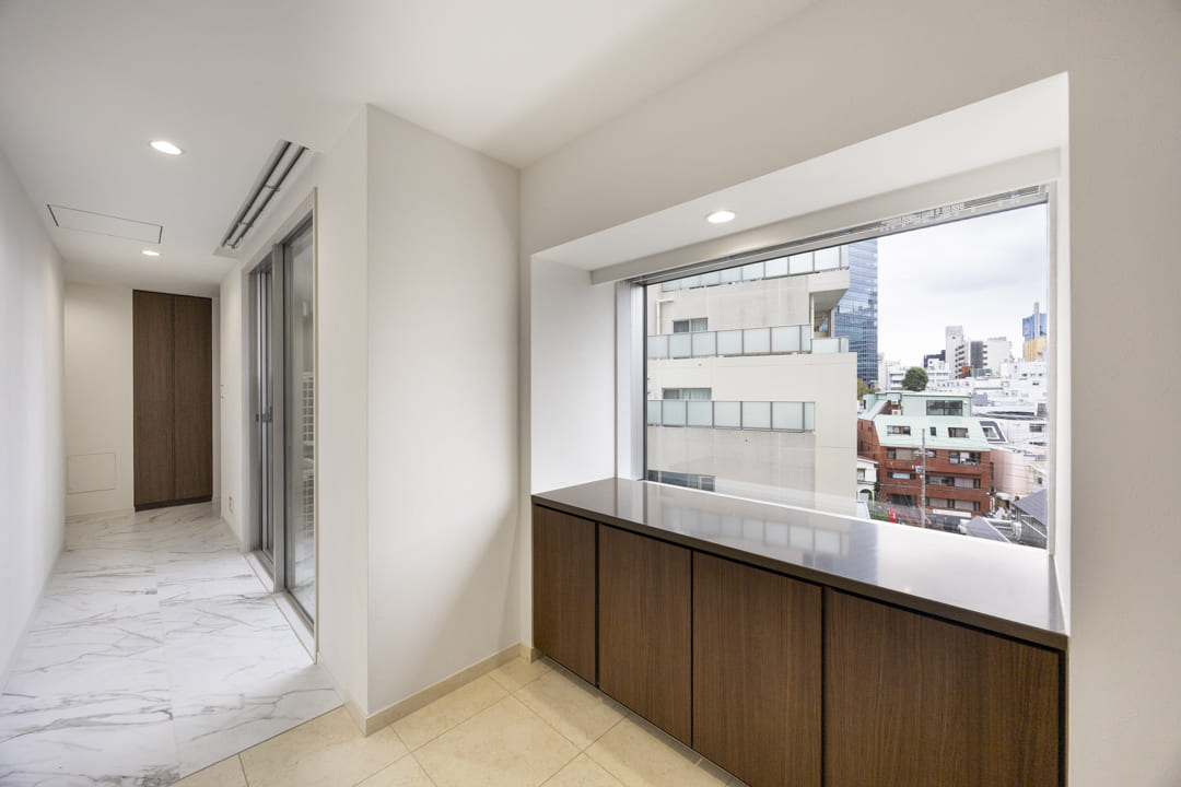 LDK側と居室側とに分かれる廊下。プライベートを大切にできる造りのため嬉しいですね。窓もあって明るく、カウンター収納も設置されています。お気に入りの小物やグリーンなどを飾ることができますよ。