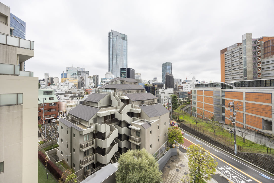 コンパクトな南東向きのバルコニーからは、六本木ヒルズ方面を望むことができます。日当たりが良好で抜け感のある眺望が広がっています。