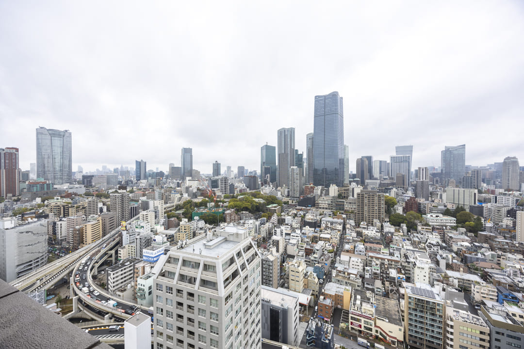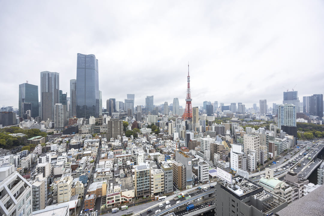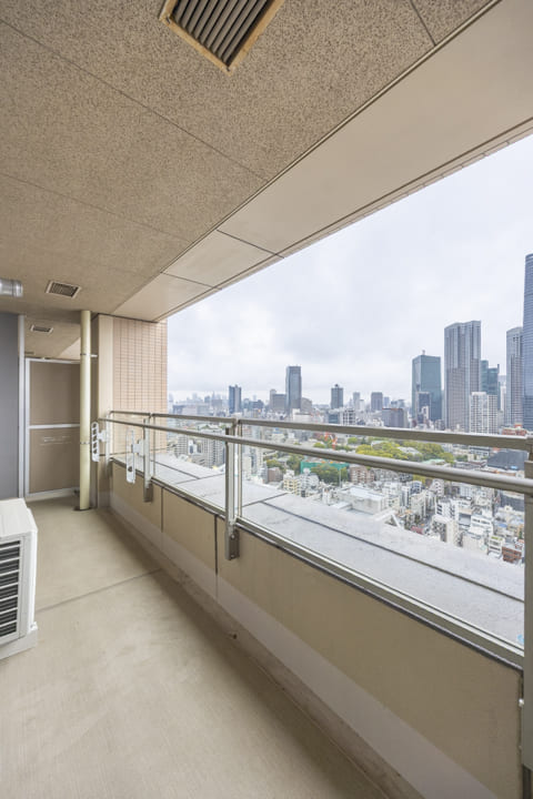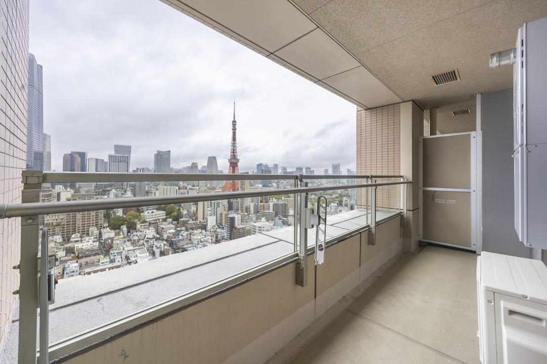 約9.38㎡のゆとりがあるバルコニーです。北東向きで、目の前には東京タワーを望む開放的な眺望が広がっています。時間帯や天候によって表情を変え、日中は街並みに映えるランドマークとして、夜にはライトアップにより印象的な景色を描き出します。その足元には芝公園の豊かな緑が広がり、都心の景色にやさしい彩りを添えています。