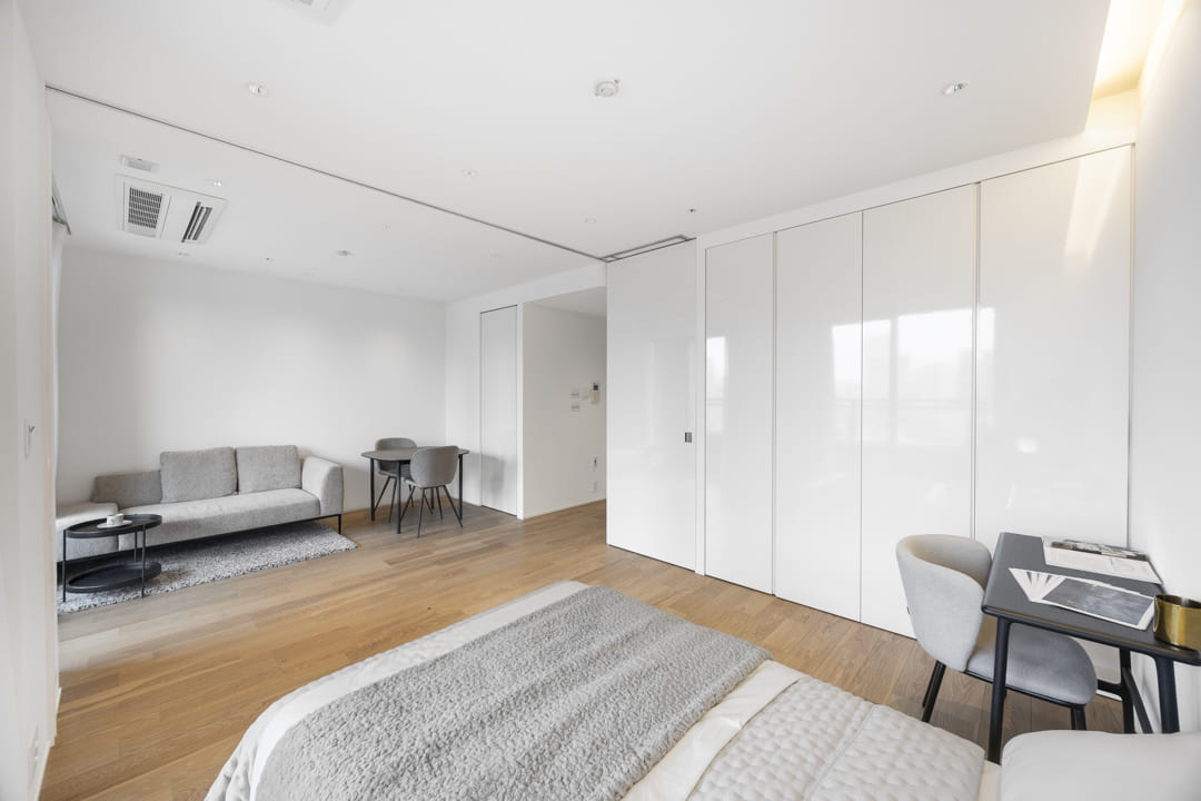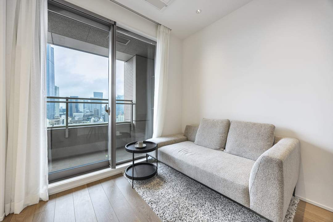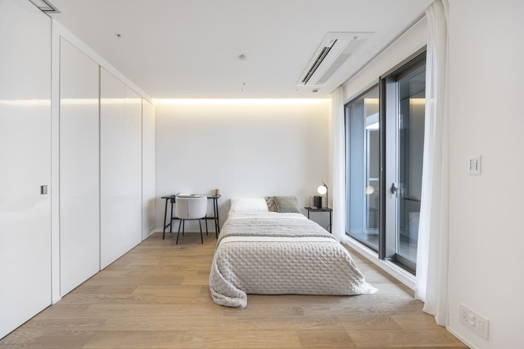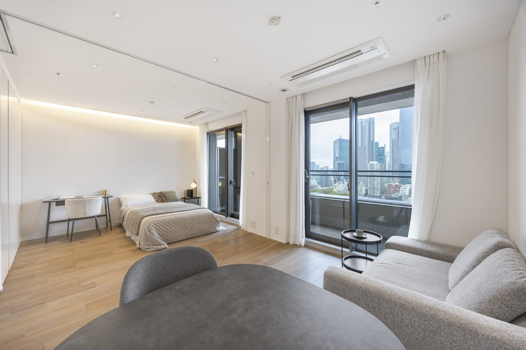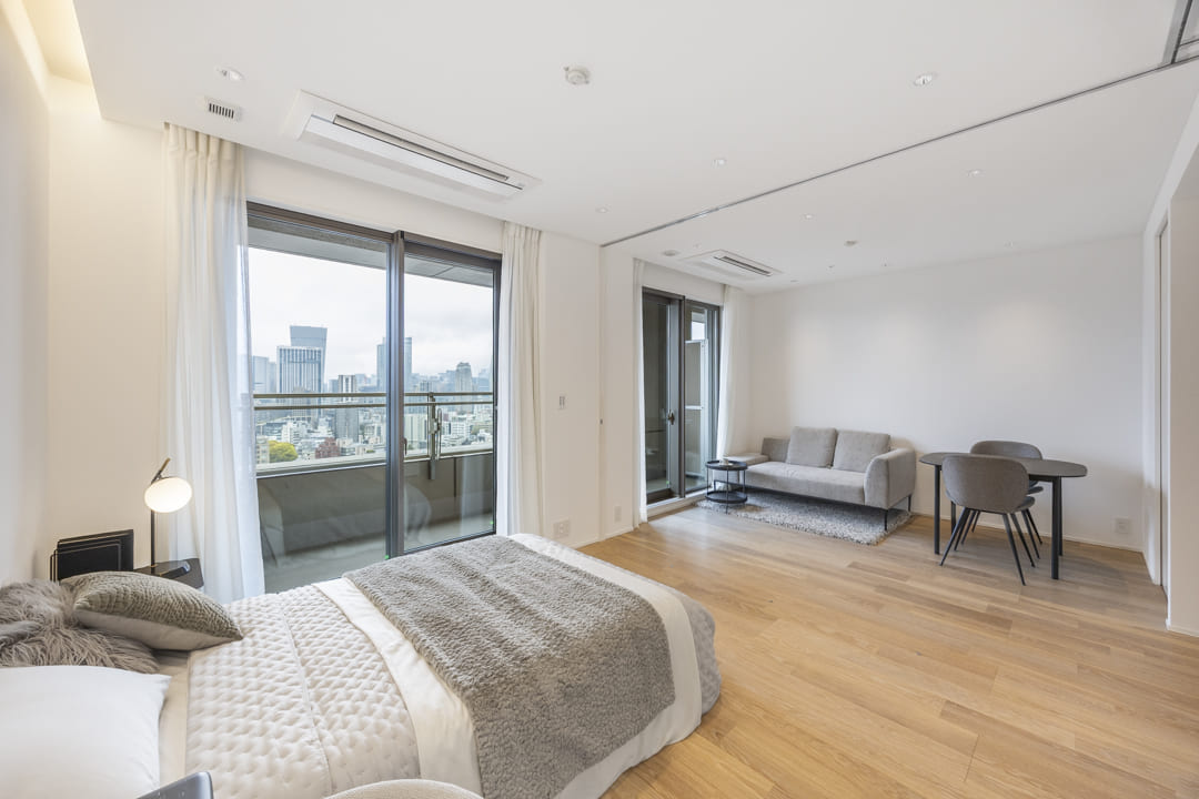 約7.3帖の寝室はリビングダイニングに隣接しています。引戸を開閉することによって、空間をフレキシブルに使うことができますよ。間接照明があしらわれていて、寛ぎの空間に。収納棚も造られています。窓からは、バルコニー越しに東京タワーが望めます!