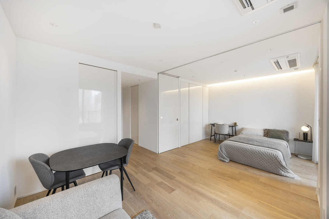約9.0帖のリビングダイニングです。寝室との仕切りはすっきりと収納できるようになっているので、お部屋を繋げて開放的にお使いいただけます。その場に応じて使い方を変えられるので便利ですね。