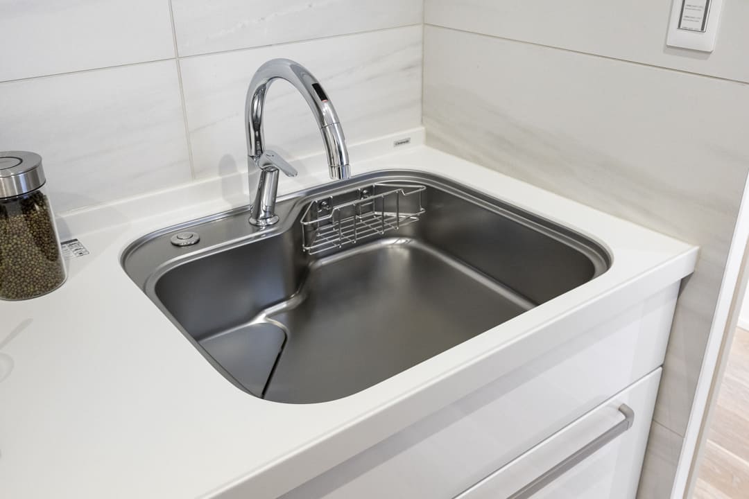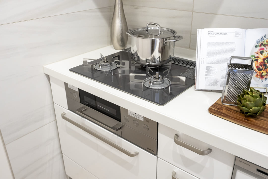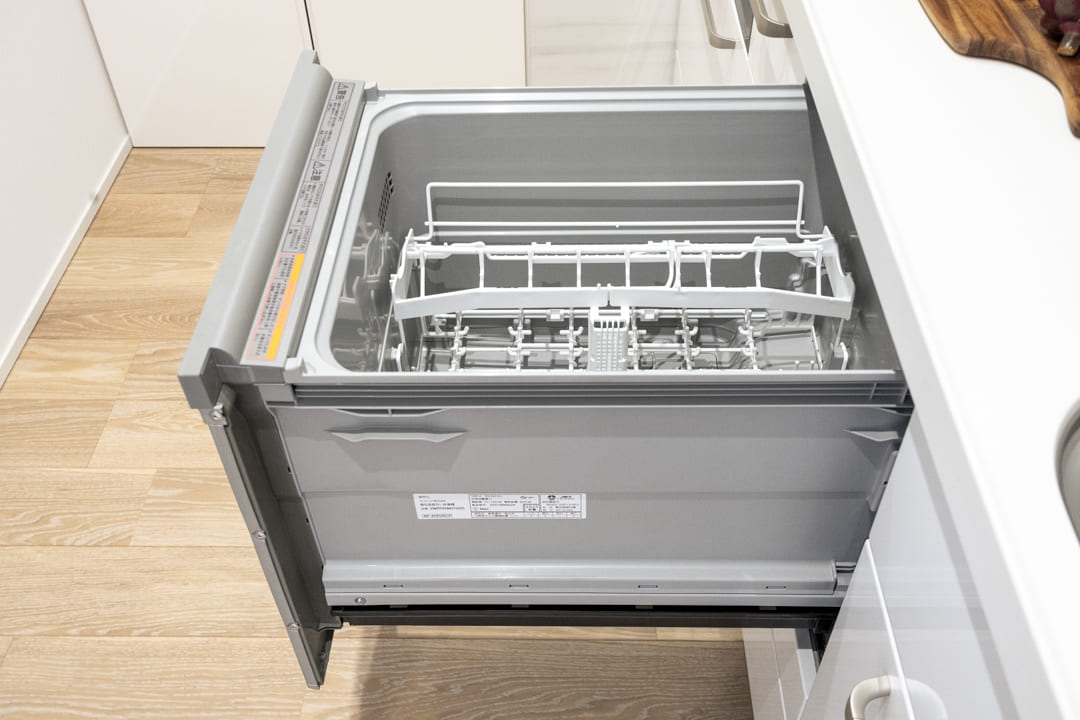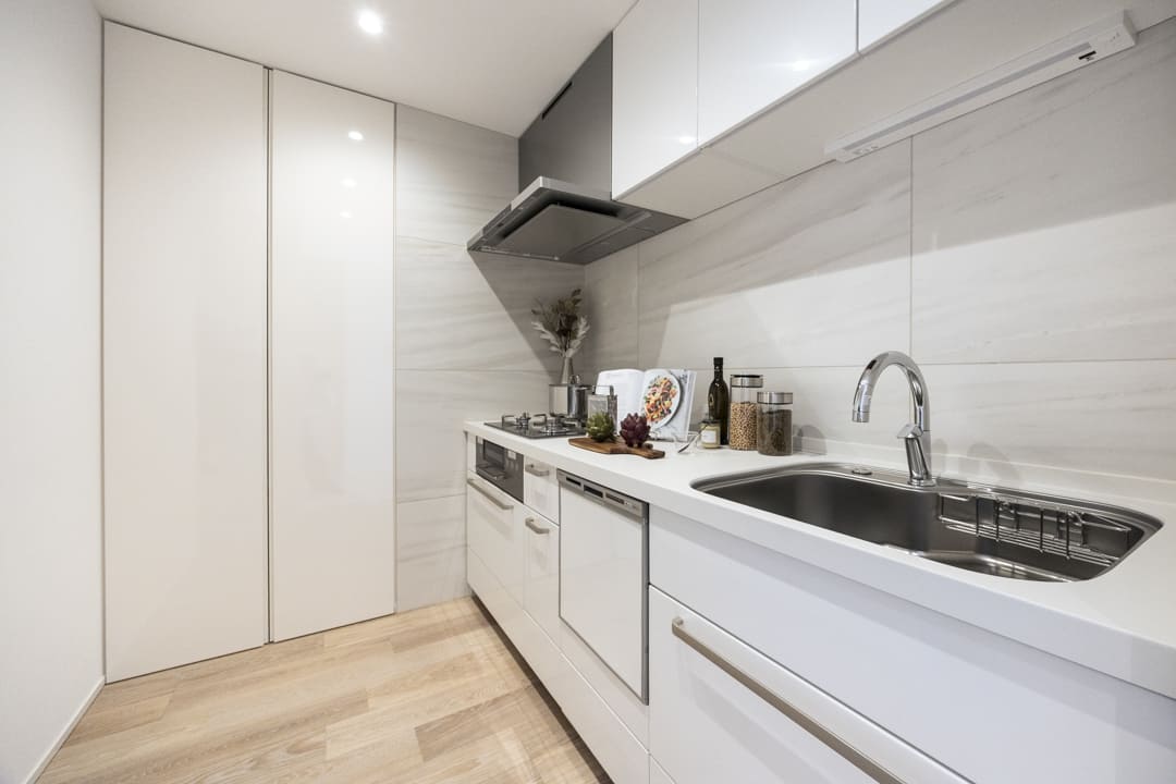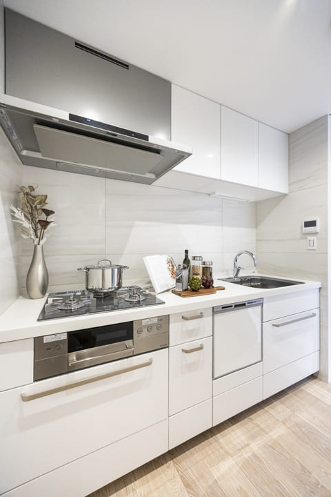 約3.5帖のキッチンは、生活感が出やすいキッチンまわりをさりげなく目隠しすることができる独立キッチンです。3口コンロ、グリル、食洗機付きと設備面も充実しています。奥には調味料やストック類などを収納できる棚が造られていて便利。