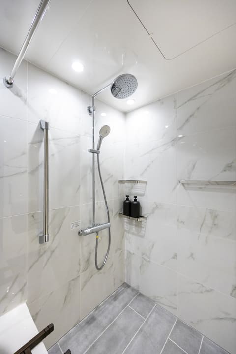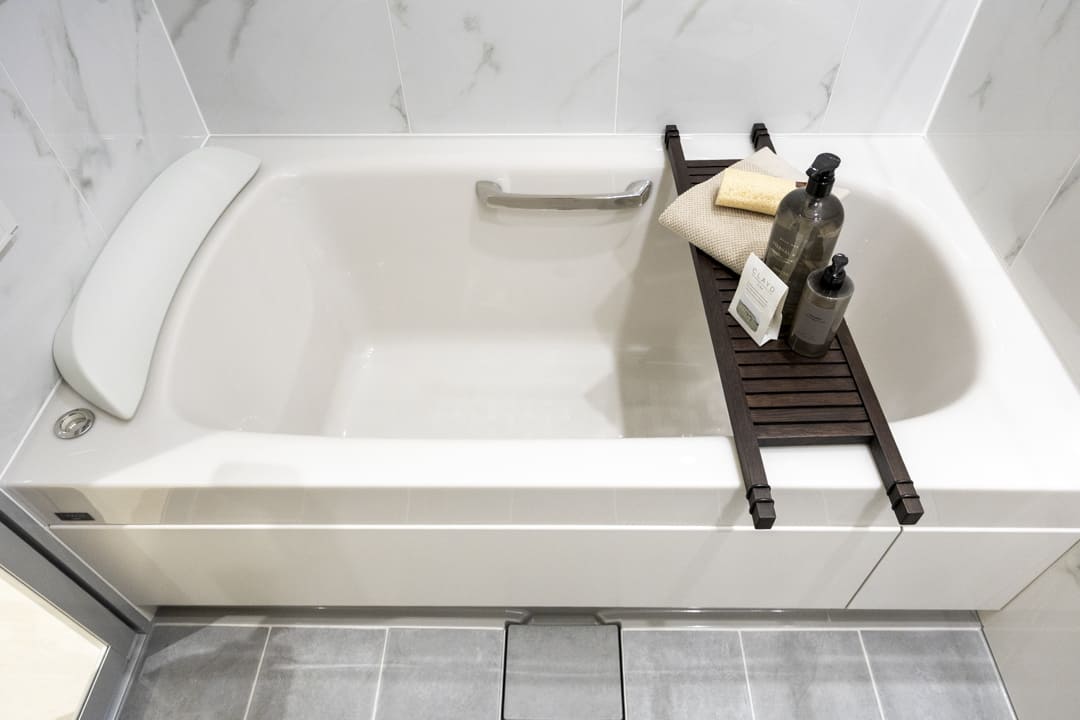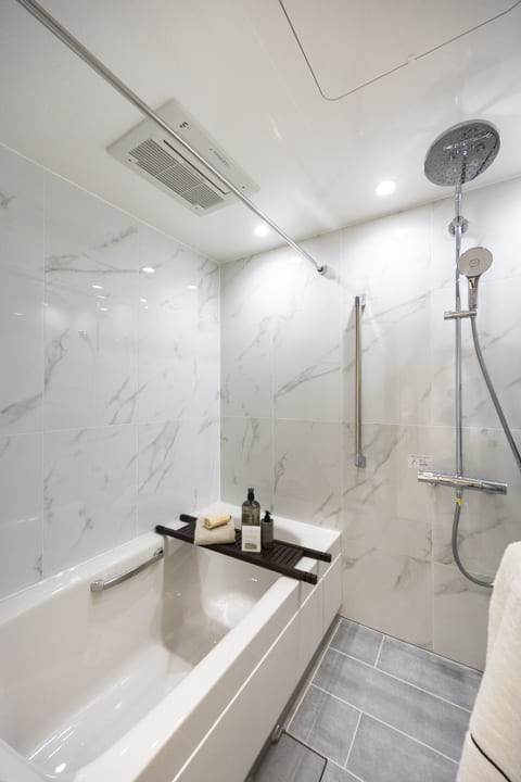 スタイリッシュな雰囲気のバスルームです。お風呂にゆっくり浸かるのが好きという方に嬉しい追い焚き機能を搭載。浴室乾燥機には暖房・乾燥・換気・涼風の機能がついており、一年中快適に過ごすことができます。また、オーバーヘッドシャワーが付いているのでたっぷりと全身で湯を浴びることができます。リラックス効果や保温効果もあって◎。