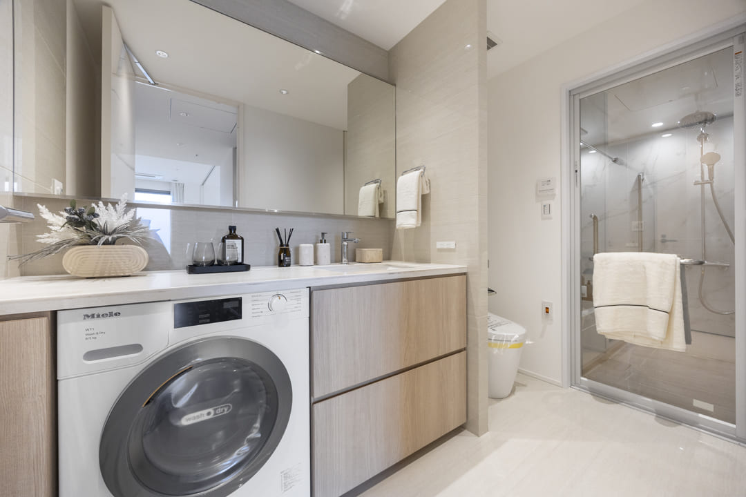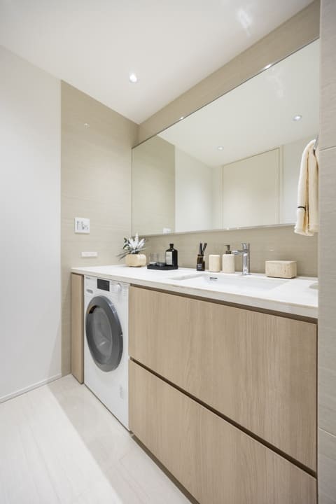 広めのカウンターで身支度などがしやすそうな洗面化粧台です。大きな鏡も見やすくて◎。下部には引き出しがあって収納スペースは確保されていますよ。さらに、Miele(ミーレ)製の洗濯乾燥機があります。アプリでコントロールができて便利。デリケートやデニム、シャツ用など様々なモードがあり、大切な洋服をケアしながら洗濯が可能です。