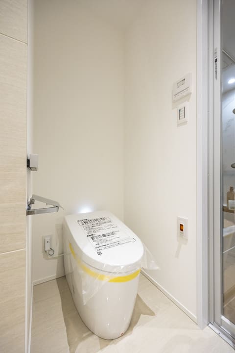 洗面室に設置されているトイレはウォシュレット一体型です。タンクレスタイプのため、すっきりとした印象に。