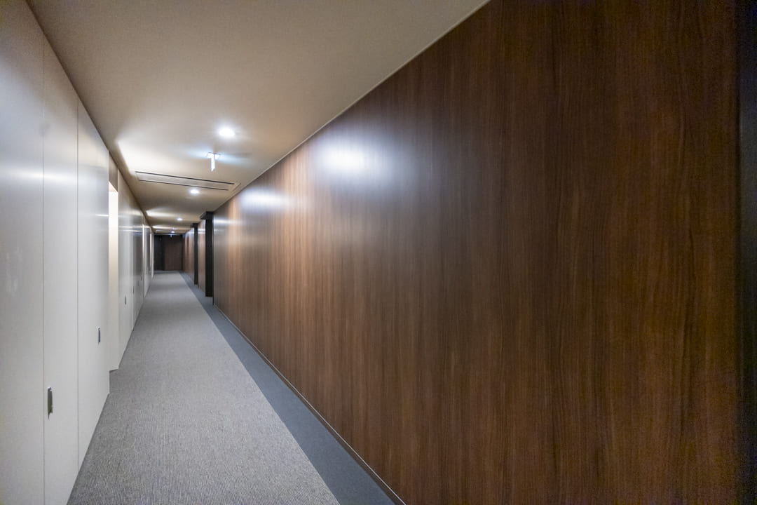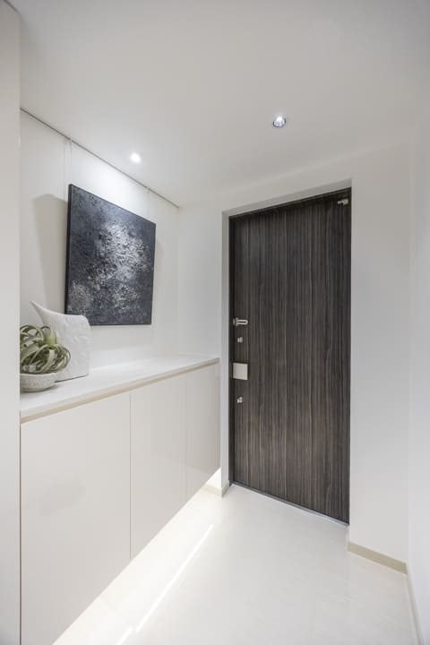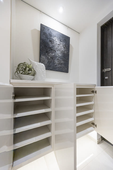 上質な雰囲気を醸し出している玄関です。シューズボックスはフロートタイプのため、靴を収納できるだけでなく、小物やグリーンなどを飾ることができます。さらに、壁面にはピクチャーレールが設置されているので、壁を傷つけずに絵画などを飾ることが可能。また、玄関収納も造られています。