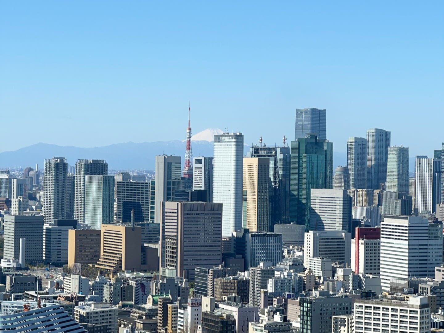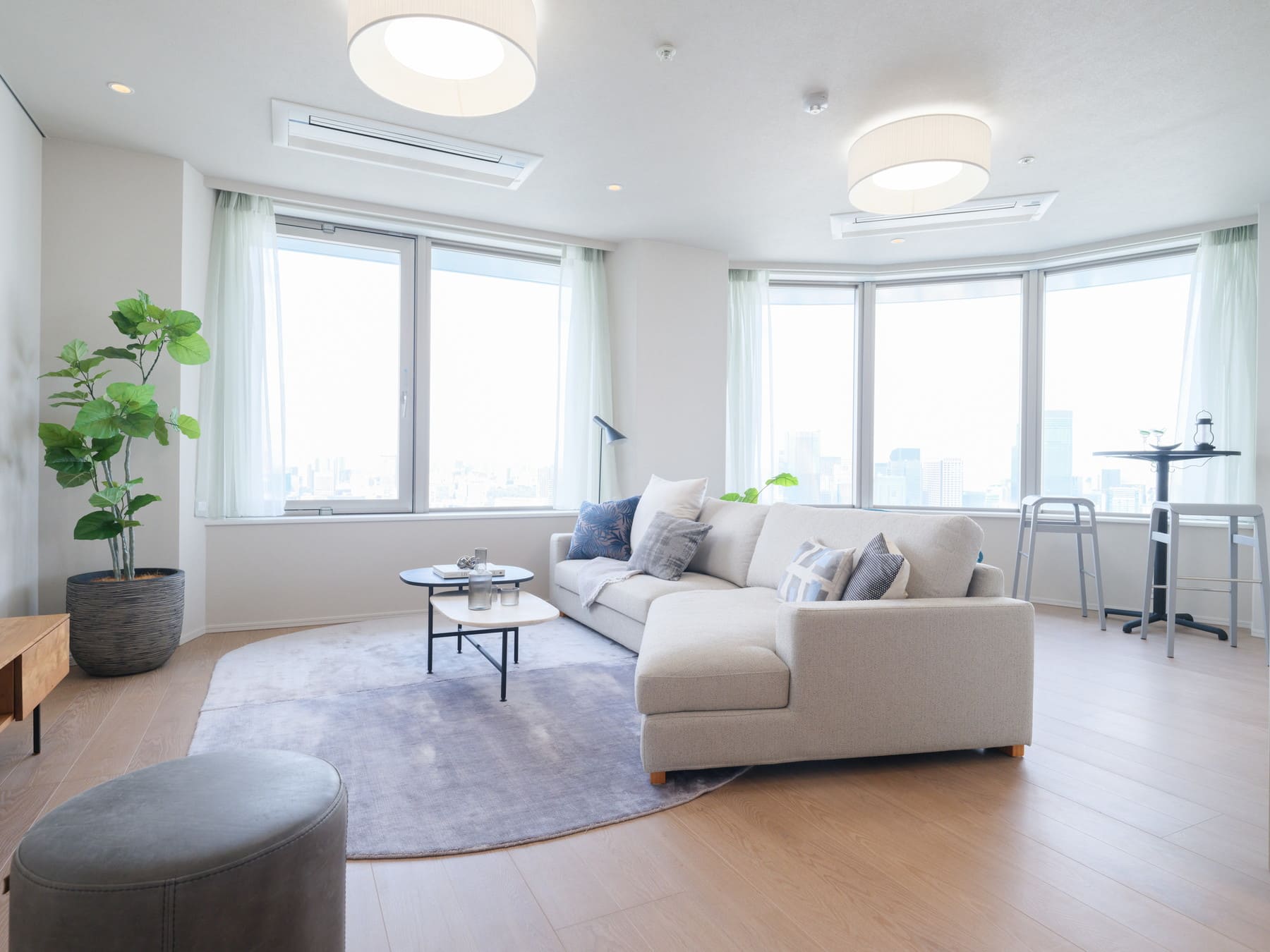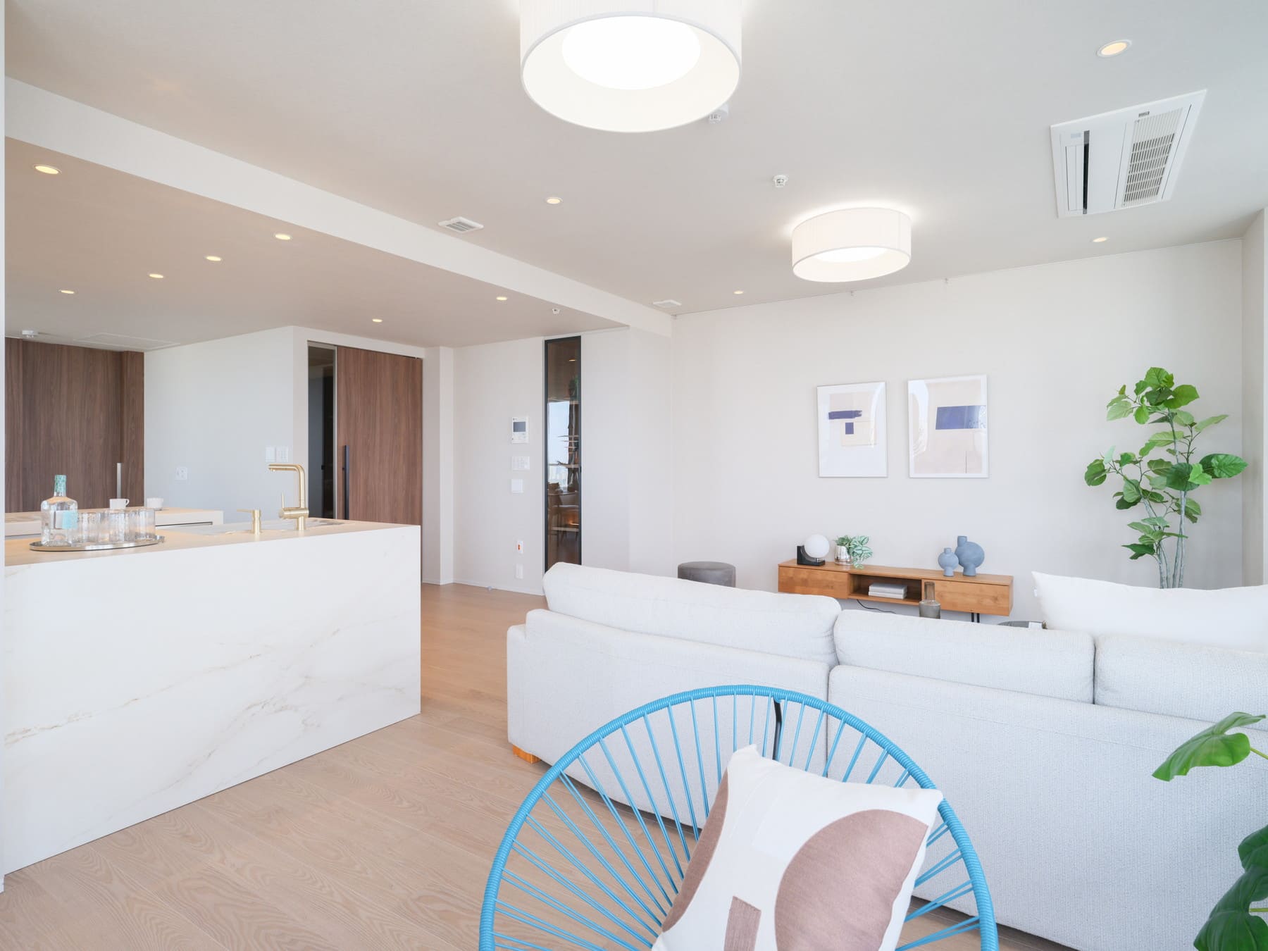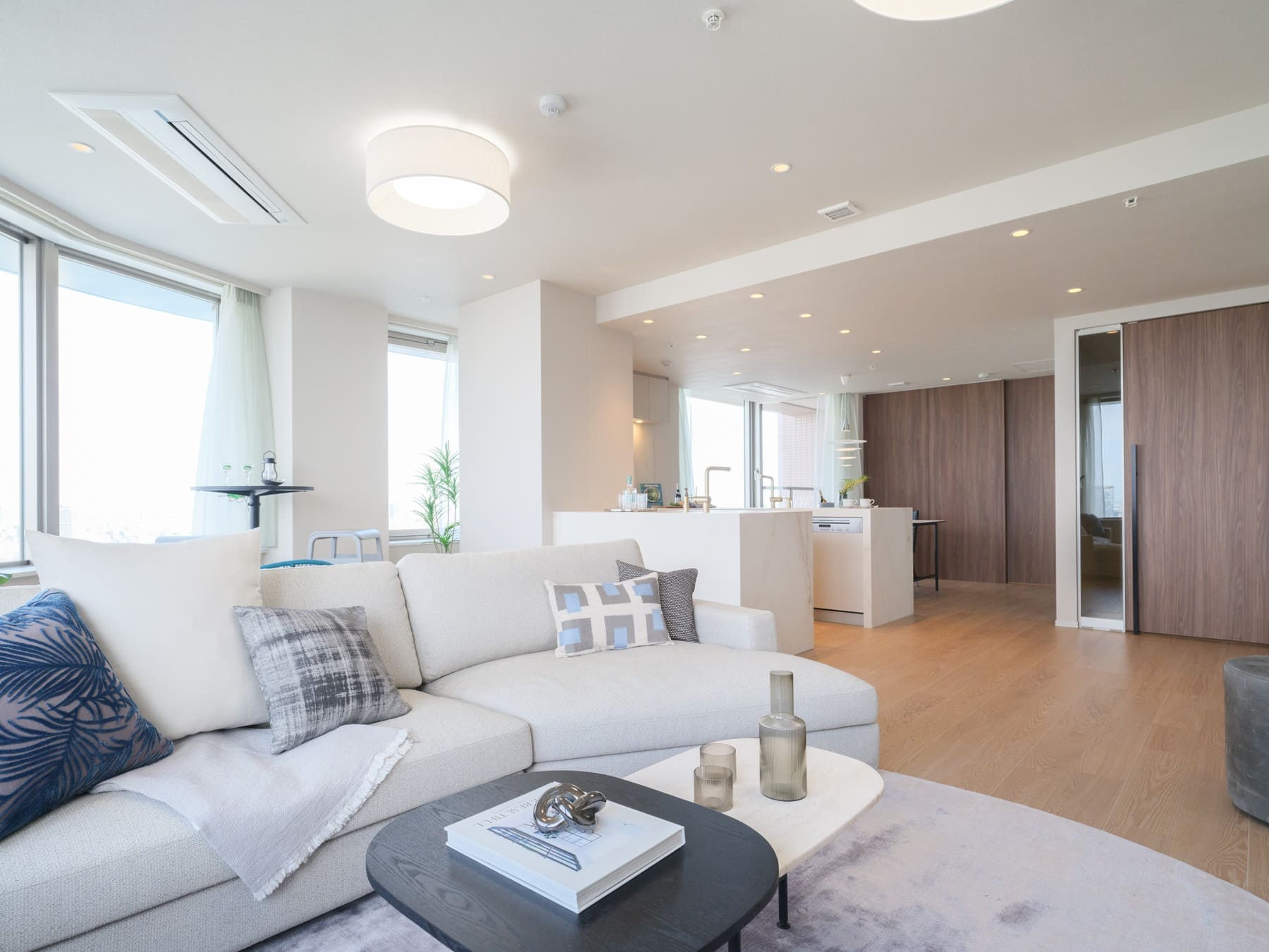 約31.7帖のゆとりあるLDK。北西向きのパノラマウィンドウが広がり、開放感溢れる空間です。大型のソファやダイニングセットをゆったりと配置でき、思い思いのレイアウトを愉しめます。東京タワー・スカイツリー・富士山を望む贅沢な眺望も魅力。夜にはライトアップされた東京タワーを望みながら、都心の煌めきとともに穏やかなリラックスタイムをお過ごしいただけます。