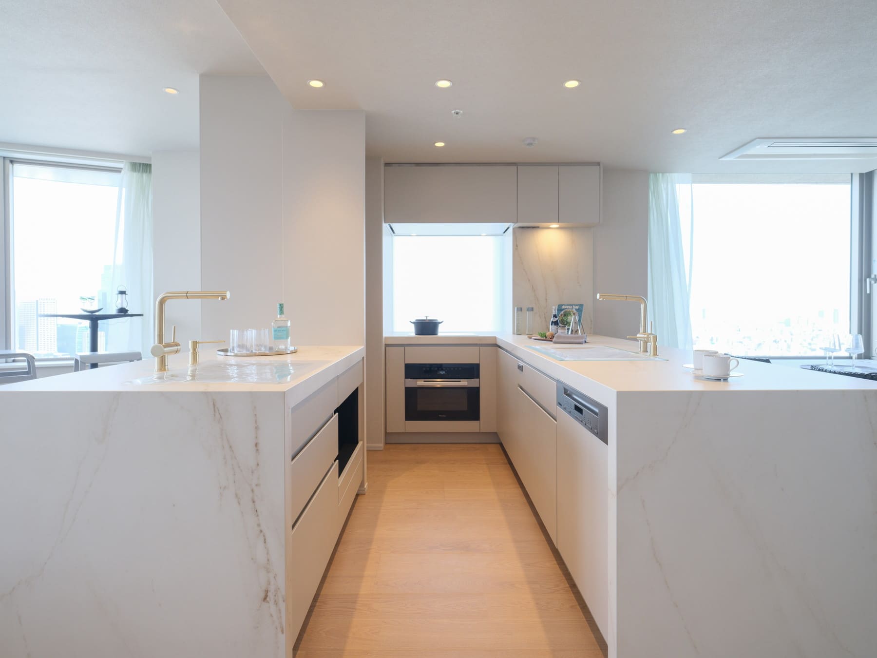 日々の家事を快適に支えるキッチン設備が充実。ツインシンクを採用し、調理と洗い物を効率よく進められます。オーブンやフロントオープンタイプの大容量食洗機も備わっており、料理の幅を広げるとともに後片付けの負担も軽減してくれます。