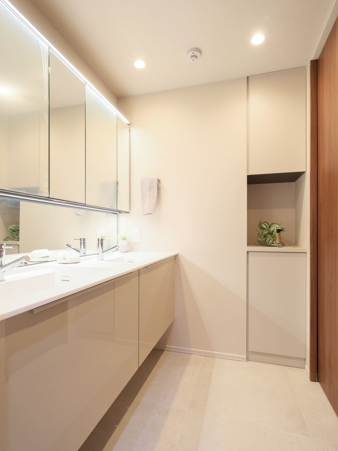 ホテルライクな2ボウル仕様の洗面化粧台。2人並んで使用でき、忙しい朝の身支度にもゆとりが生まれます。ミラーボックスを備え、洗面まわりの小物をすっきり収納できるのも嬉しいポイントです。