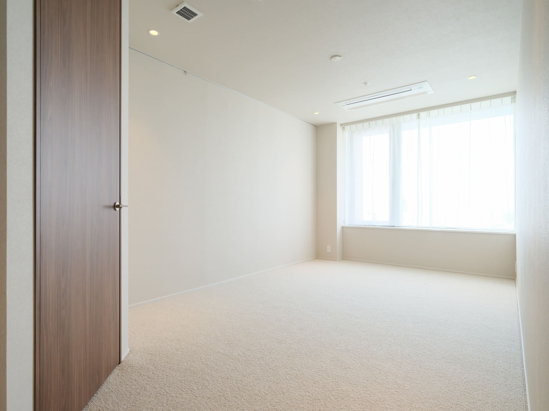 約9.5帖のゆとりある洋室1。主寝室におすすめの一室です。カーペット敷きのやわらかな足ざわりが心地よく、穏やかな時間を過ごせる空間。リビング同様にビルトインエアコンとピクチャーレールを備え、快適性にも配慮されています。