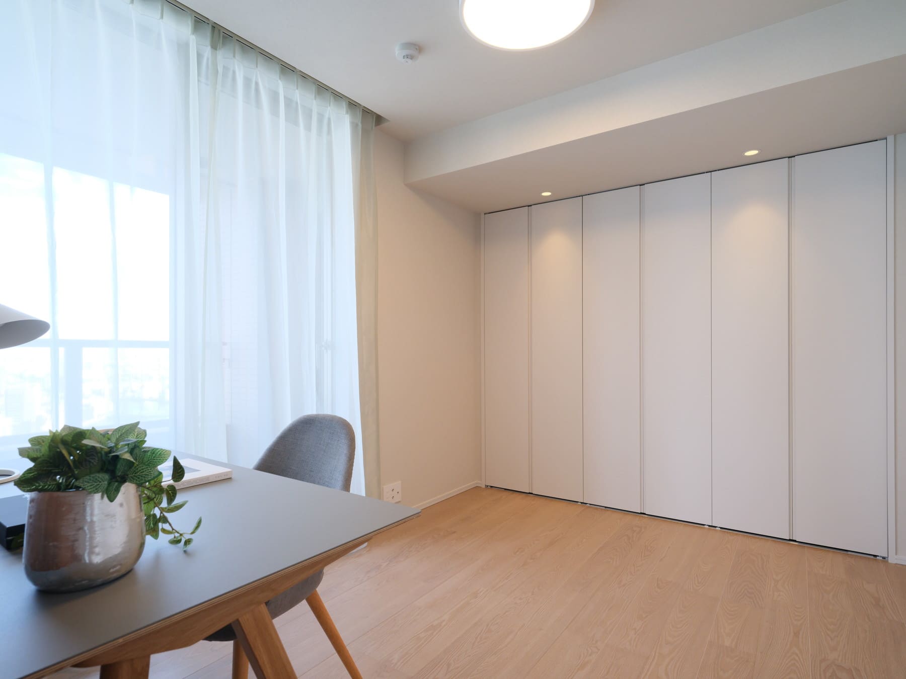 LDKに隣接する約5.9帖の洋室3。北向きバルコニーに面し、ほどよい開放感が広がります。壁一面にクローゼットを備えており、衣類や日用品をすっきり収納できます。寝室としてはもちろん、ワークスペースや趣味のお部屋など、多目的に活用できる一室です。