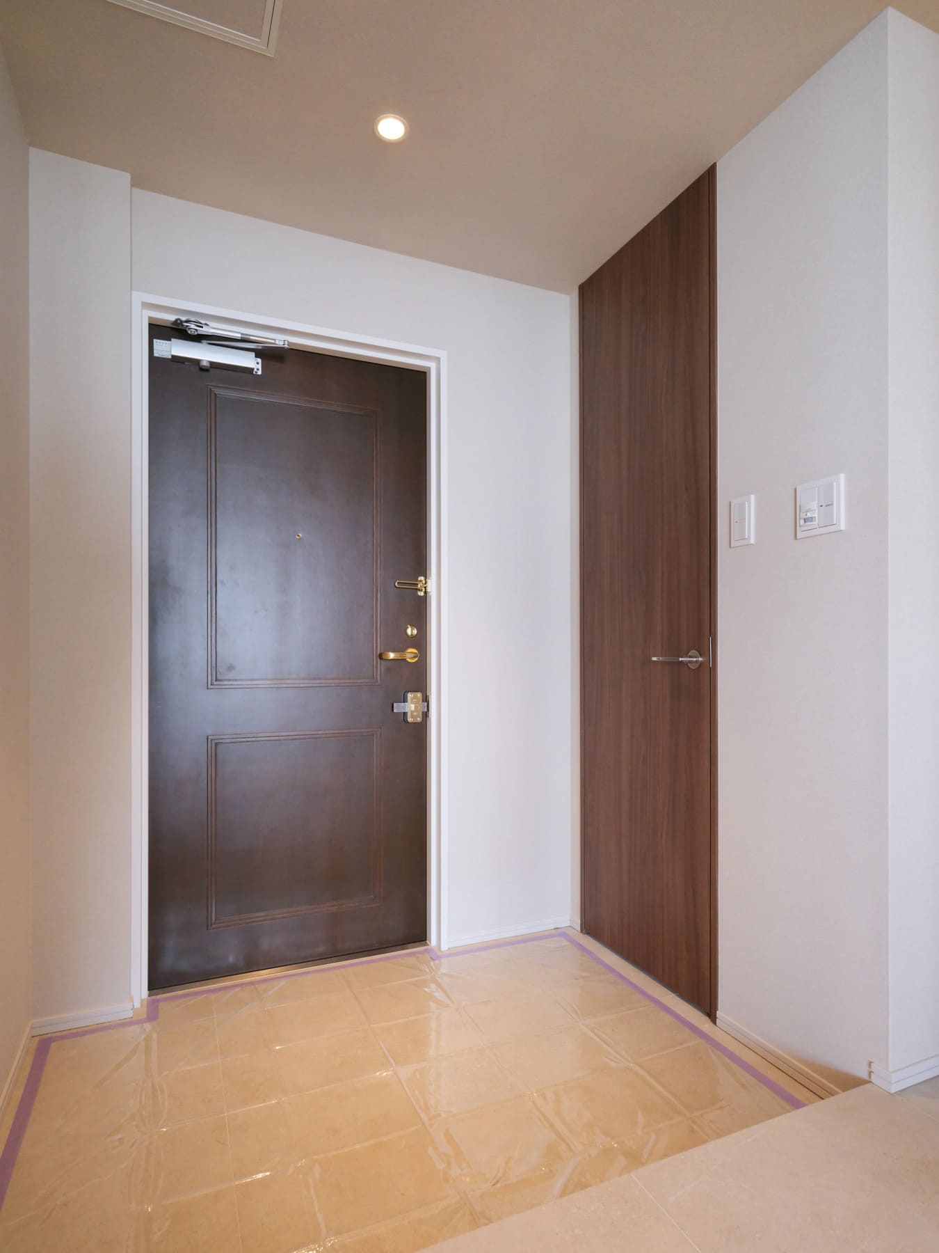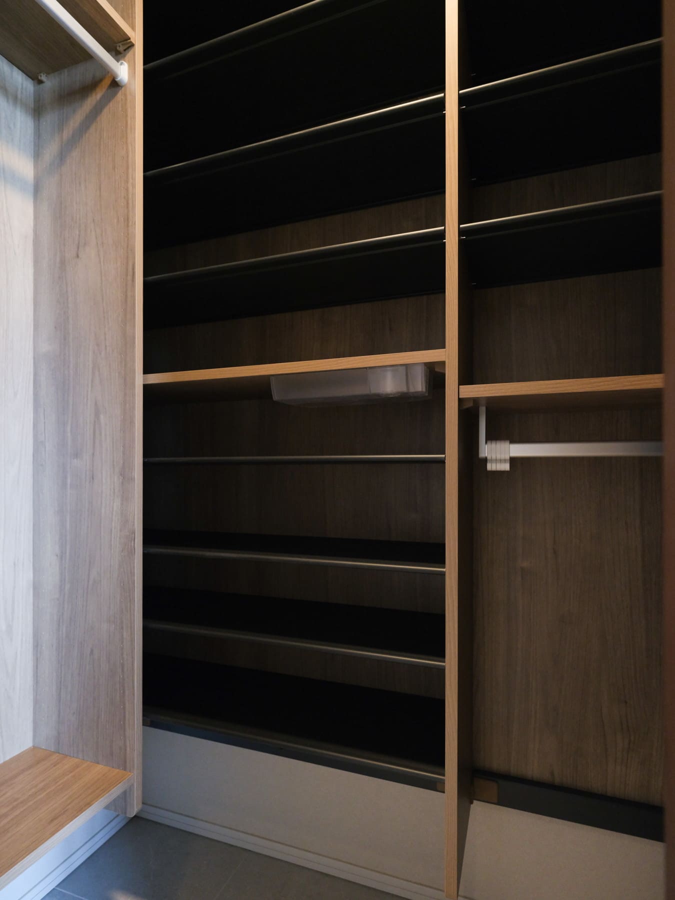 クラシカルな雰囲気が漂うドアが印象的な玄関スペース。SIC(シューズインクローゼット)を備え、靴はもちろん、雨具やアウトドアグッズなども収納可能です。玄関まわりをすっきりと整え、気持ちよくお出かけや帰宅ができる空間となっています。