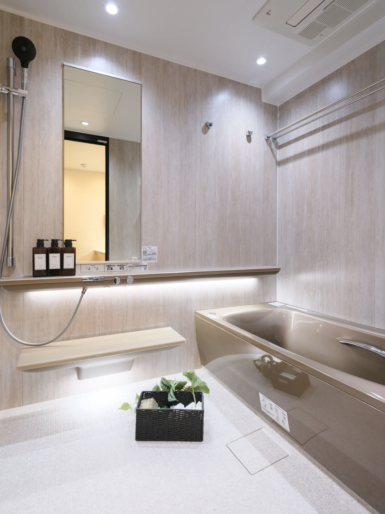 やわらかな照明がラグジュアリーな雰囲気を演出するバスルーム。冷えやすい肩まわりに大流量のお湯が流れる「肩楽湯」と、ランダムな曲線で円を描くように噴出する水流が腰まわりを心地よく刺激する「腰楽湯」を搭載し、一日の疲れをやさしく癒します。さらに、浴室換気乾燥機や調光・調色機能も備わっており、心地よいリラックスタイムをお過ごしいただけます。