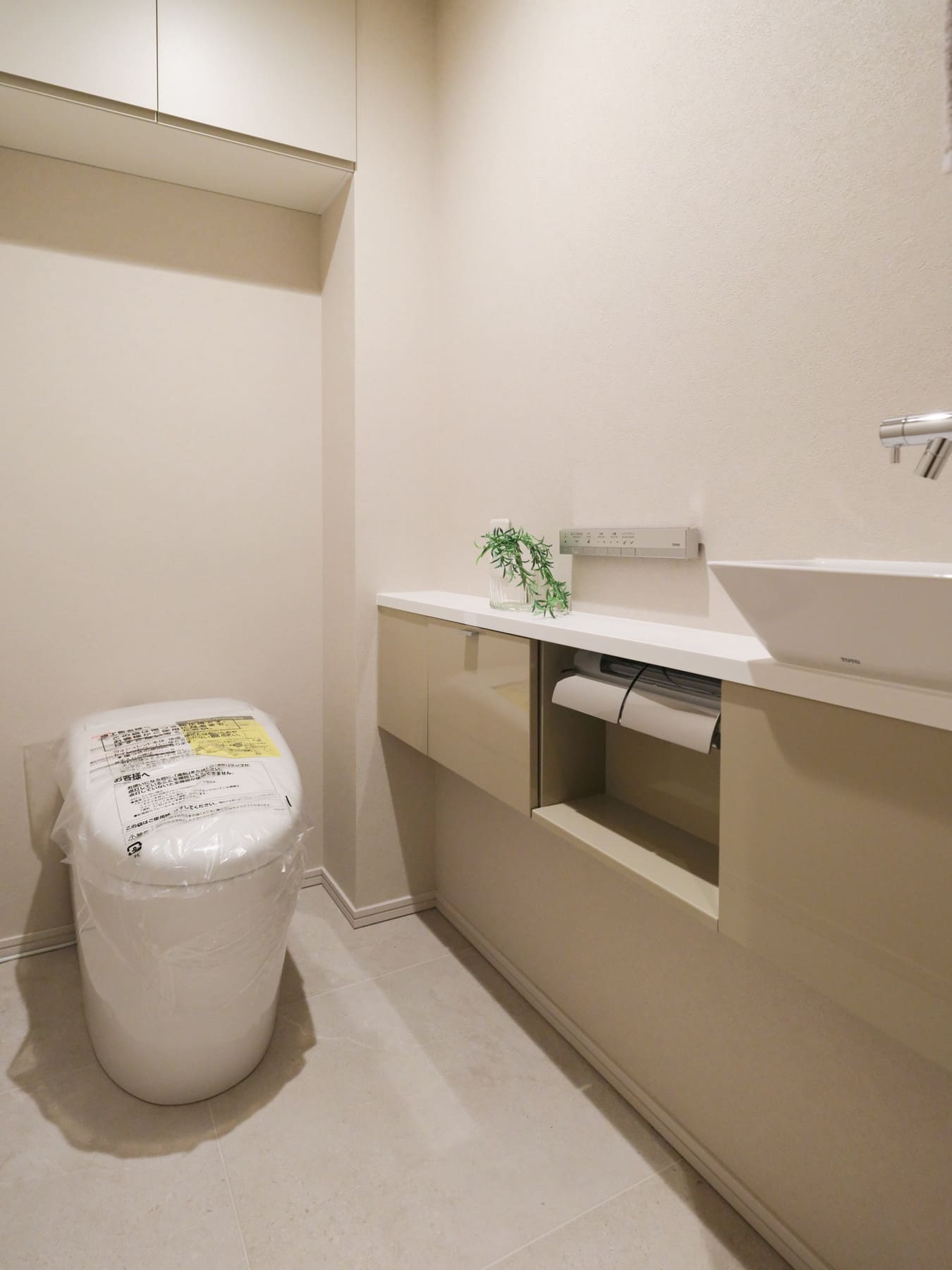 廊下に面し、独立性に配慮されたレストルーム。TOTO製の洗浄機能付トイレに新規交換済みです。タンクレス仕様ですっきりとした印象で、お手入れのしやすさも魅力。手洗いカウンター付きのため、ゲストを洗面室へ案内することなくご使用いただける設計です。さらに、洗面室側にもトイレが設けられており、シーンに応じて使い分けができる便利な間取りとなっています。