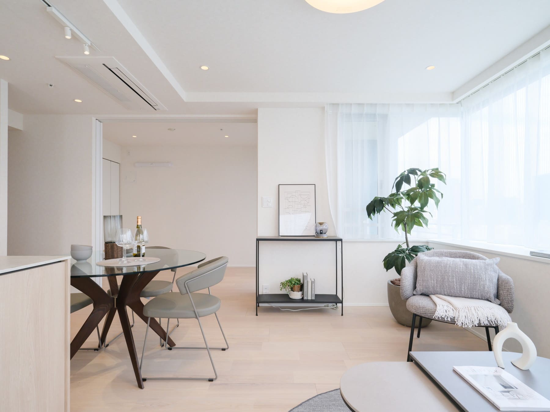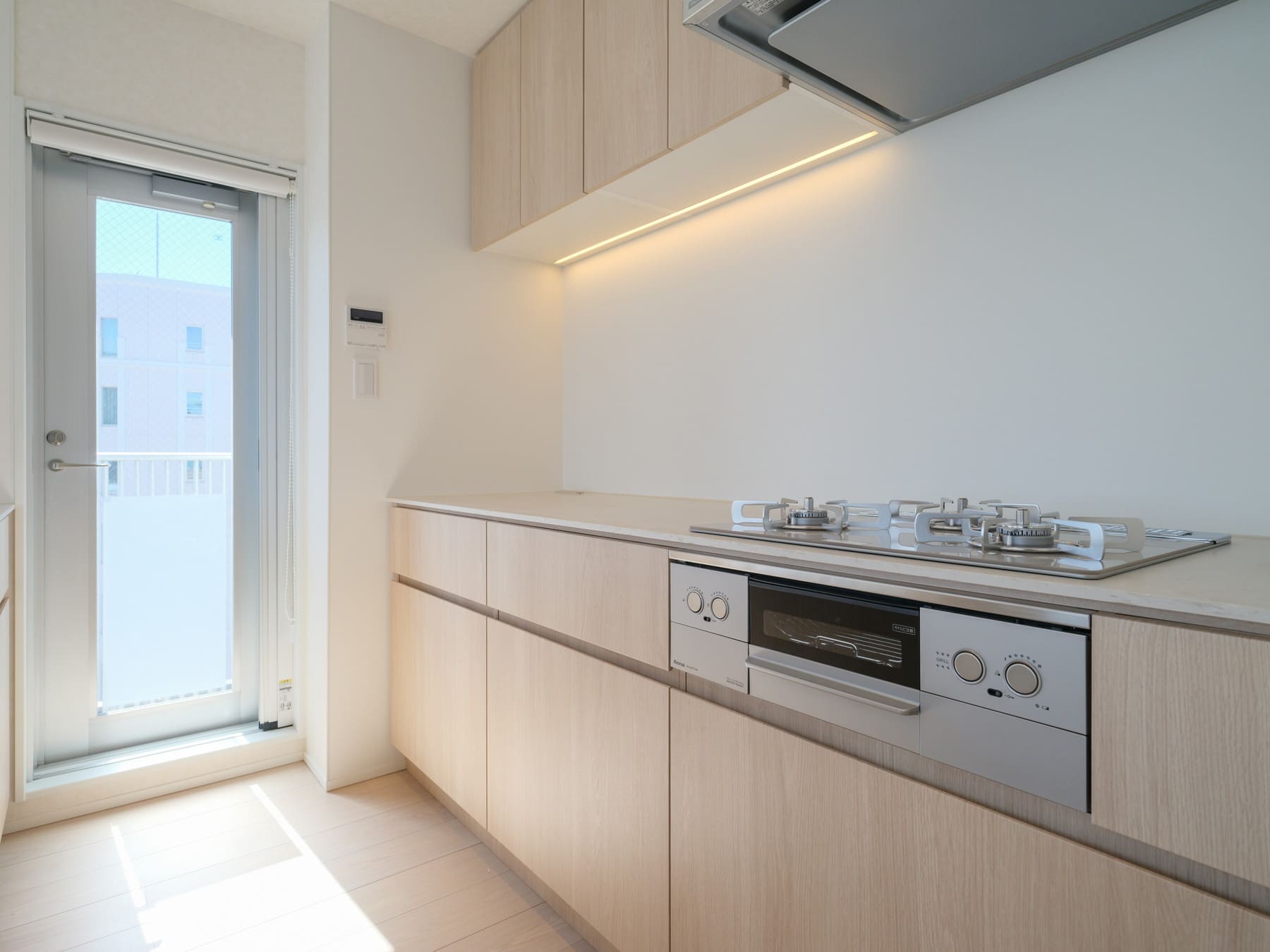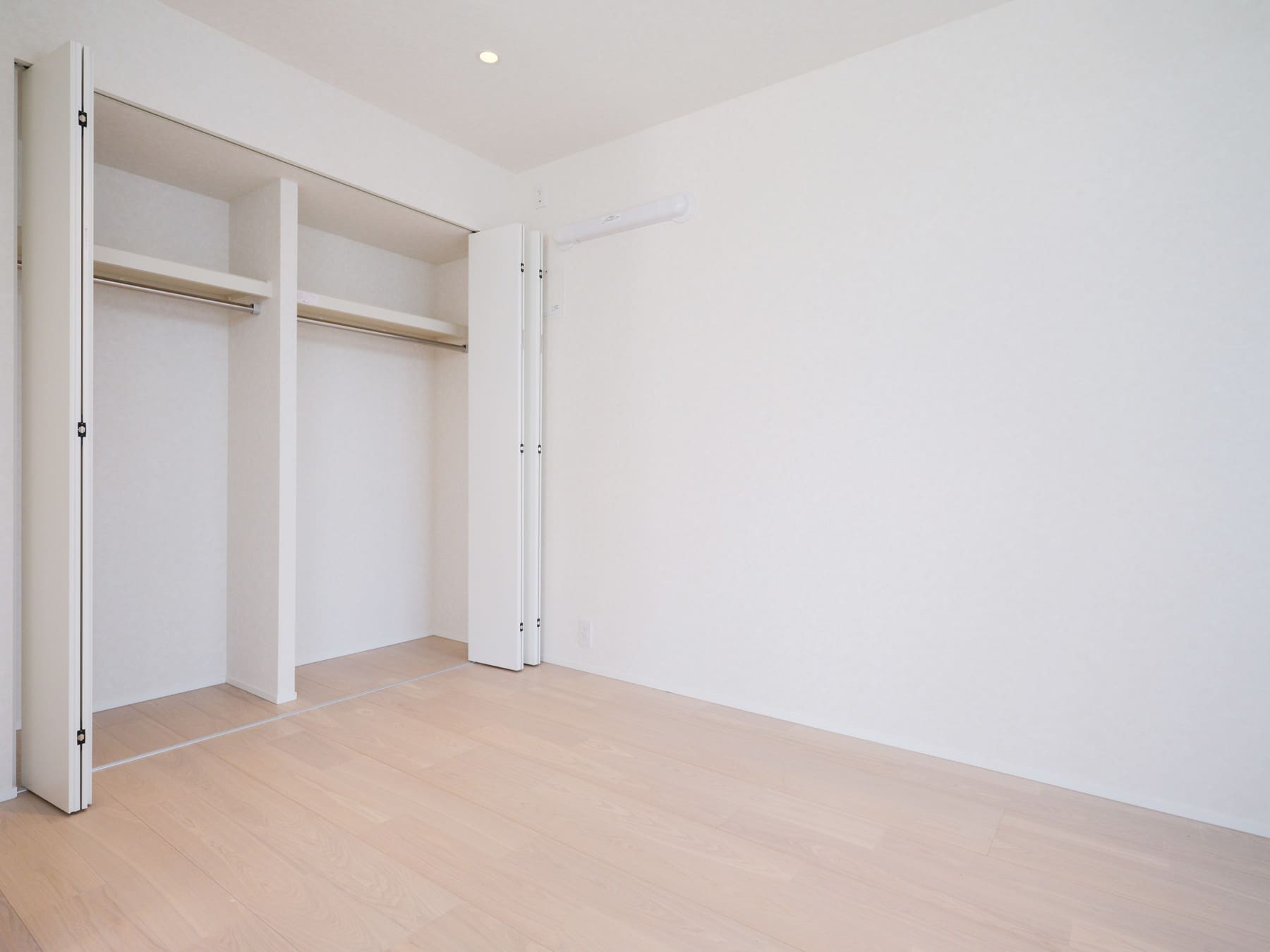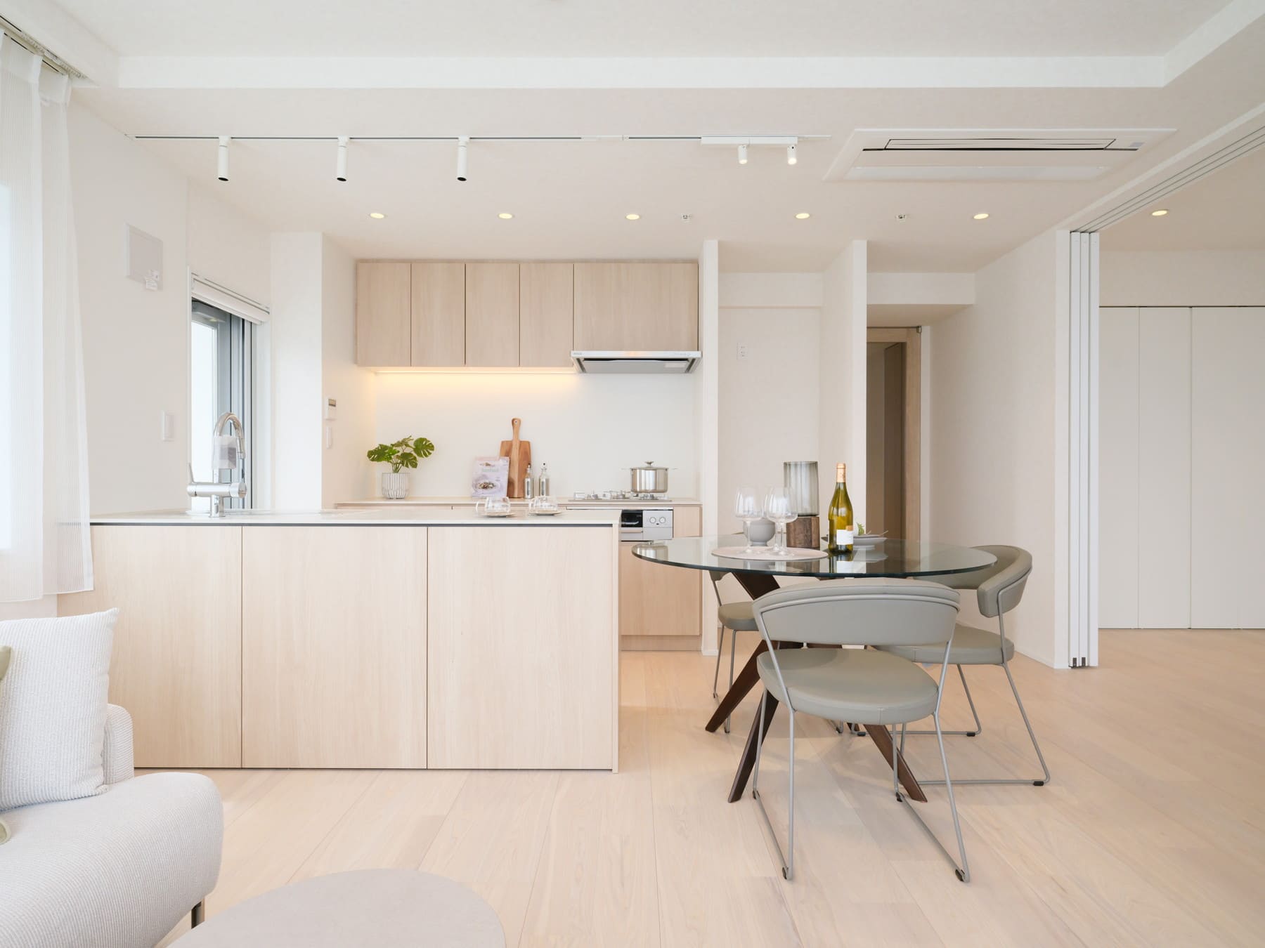 白い壁紙と木目フローリングを基調とした、ナチュラルで落ち着きのある内装。さまざまなテイストの家具とも調和し、インテリア選びの幅が広がります。エアコンはスタイリッシュなビルトインタイプで、空間をすっきりと保ちます。