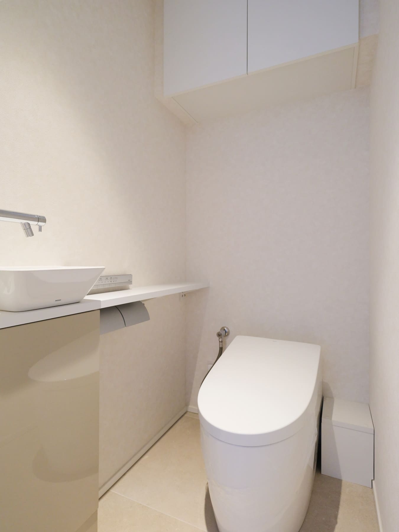 廊下に面していて独立性に配慮されたレストルーム。TOTO製の洗浄便座付トイレに新規交換済みです。タンクレストイレやスティックリモコンを採用し、スタイリッシュな空間に。手洗いカウンター付きのため、ゲストを洗面室へ案内することなくお使いいただける設計です。