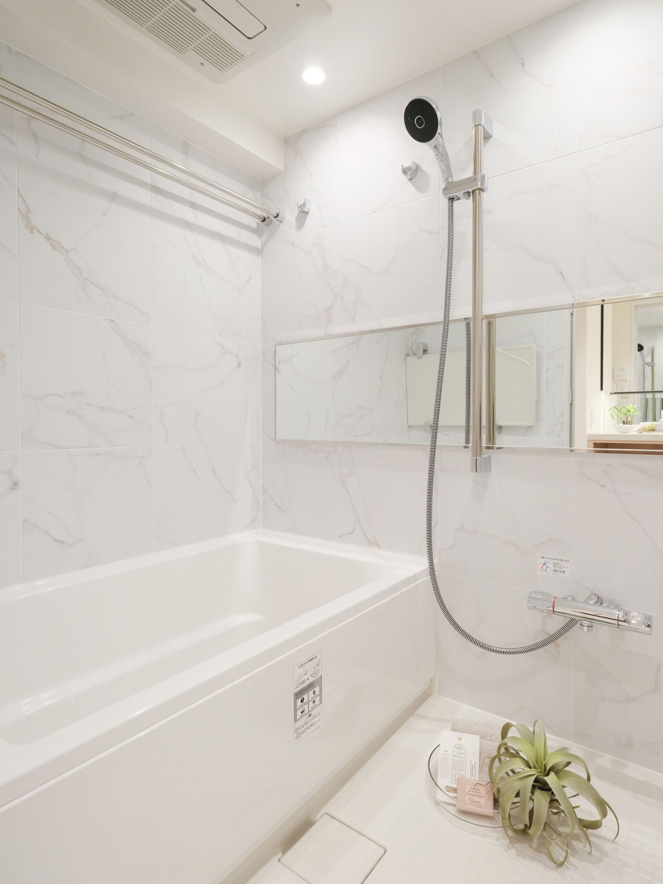 大理石調デザインで上質な雰囲気が漂うバスルーム。寒い日も快適に入浴でき、カビ対策や雨の日のお洗濯にも活躍する浴室換気乾燥暖房機を搭載しています。1年を通して快適なバスタイムを過ごせそうですね。