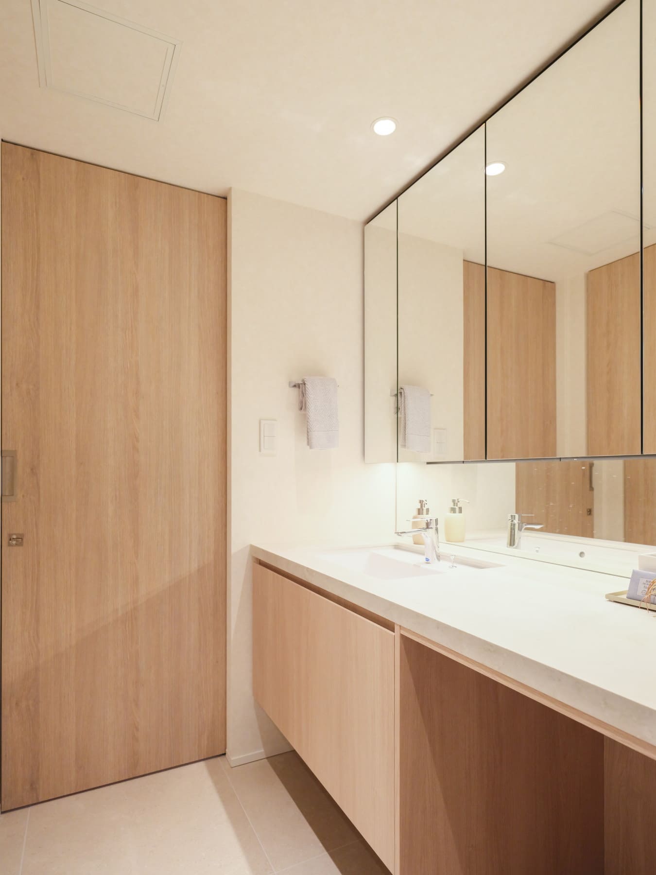 フロートタイプの洗面化粧台は、すっきりとホテルライクな印象。大きな鏡付きで使い勝手が良く、空間に奥行きが生まれます。洗面ボウルは片側に寄せられ、ゆとりあるカウンタースペースを確保。化粧品やドライヤーを置ける余裕があります。カウンター下には椅子を収められる設計で、座って落ち着いて身支度ができるのも嬉しいポイントです。