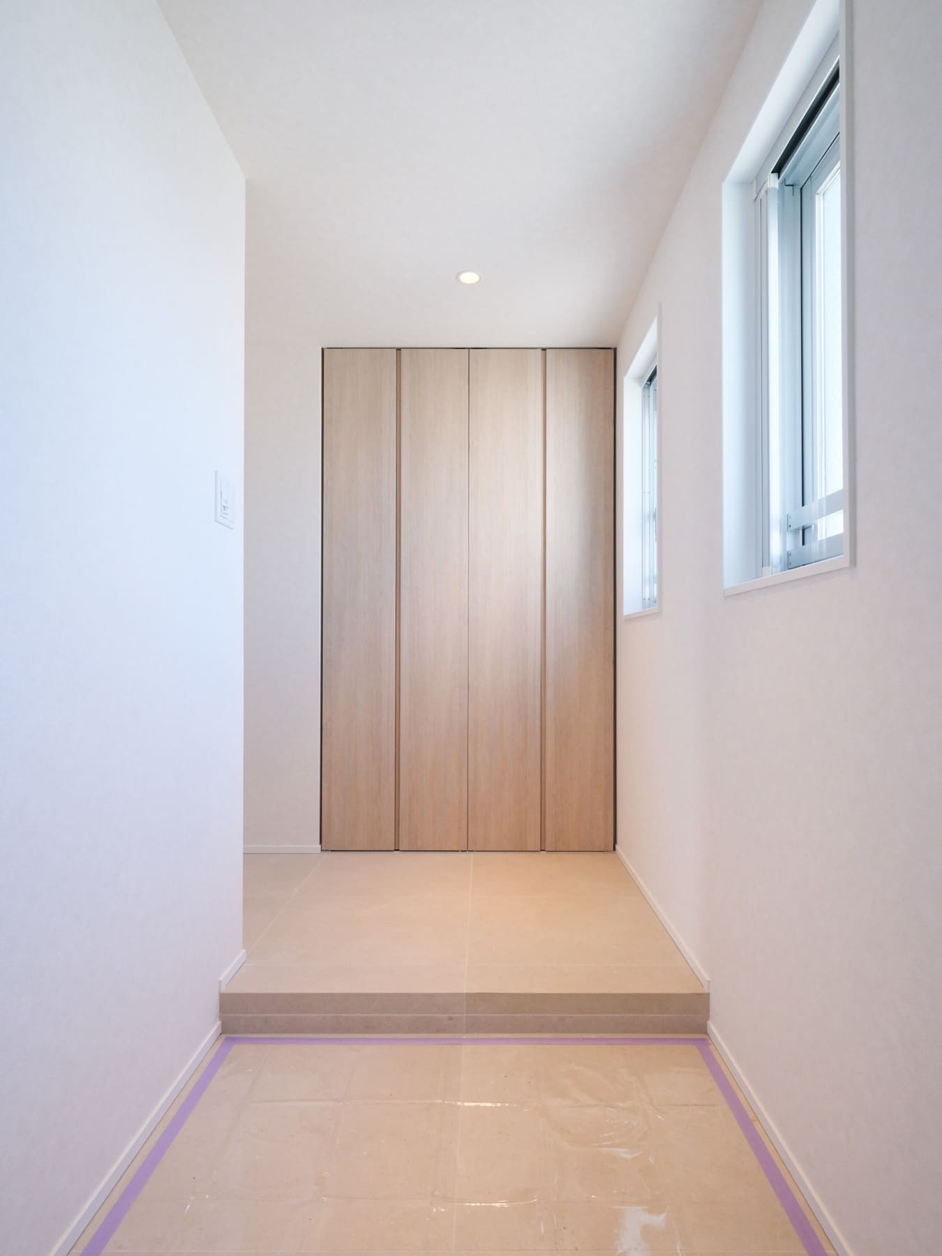 窓から自然光が届く、明るい玄関スペース。換気しやすいのも嬉しいポイントです。正面には大容量のシューズボックスを完備。玄関まわりをすっきりと整え、気持ちよくお出かけや帰宅ができる空間となっています。
