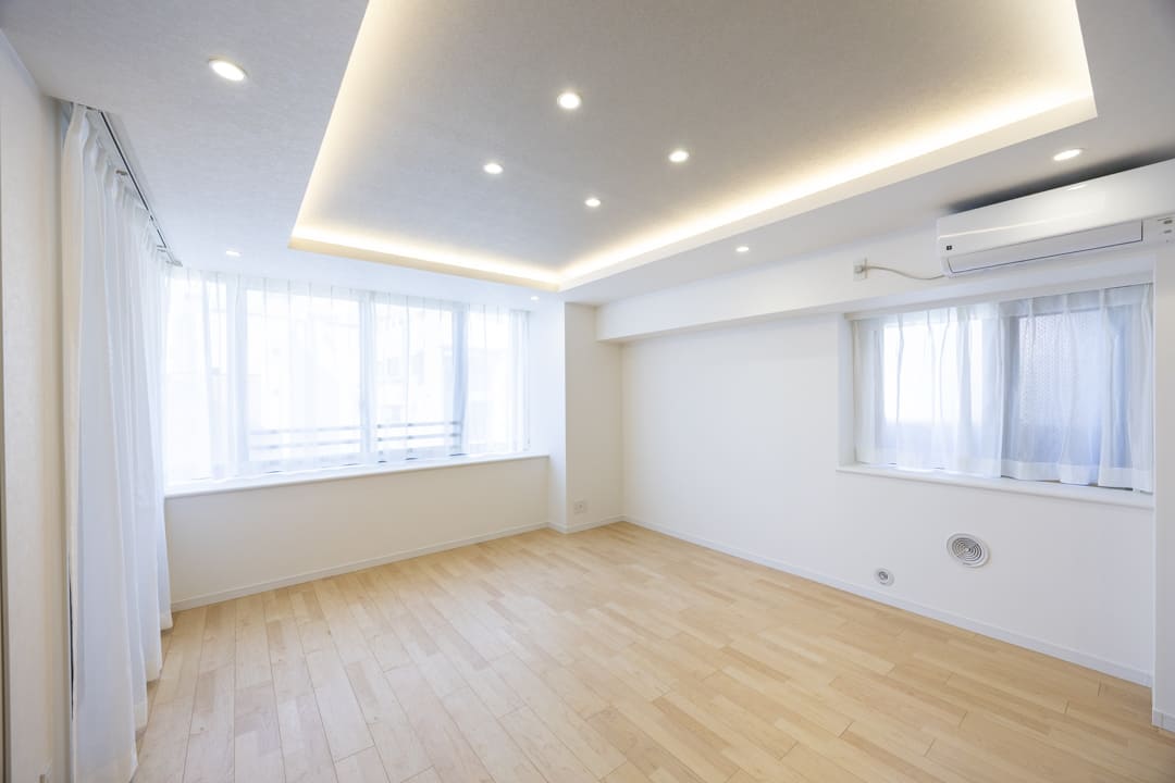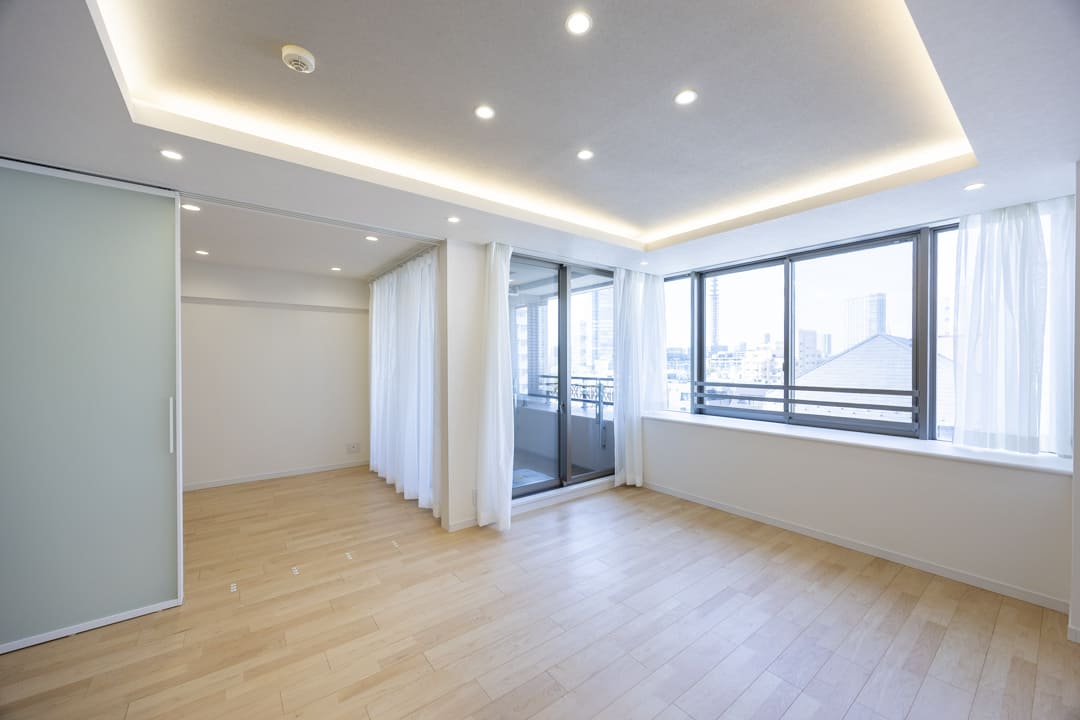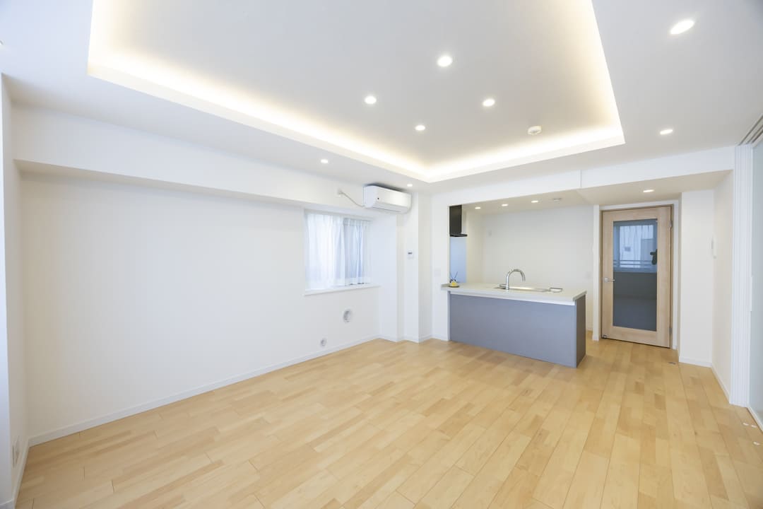約13.8帖のリビングダイニングは、二面採光で日当たり・通風が良好です。天井は折り上げ天井になっているので、空間に広がりを与え、間接照明が上品さを演出してくれています。寝室2との引戸には透け感があって圧迫感を感じにくくなっています。