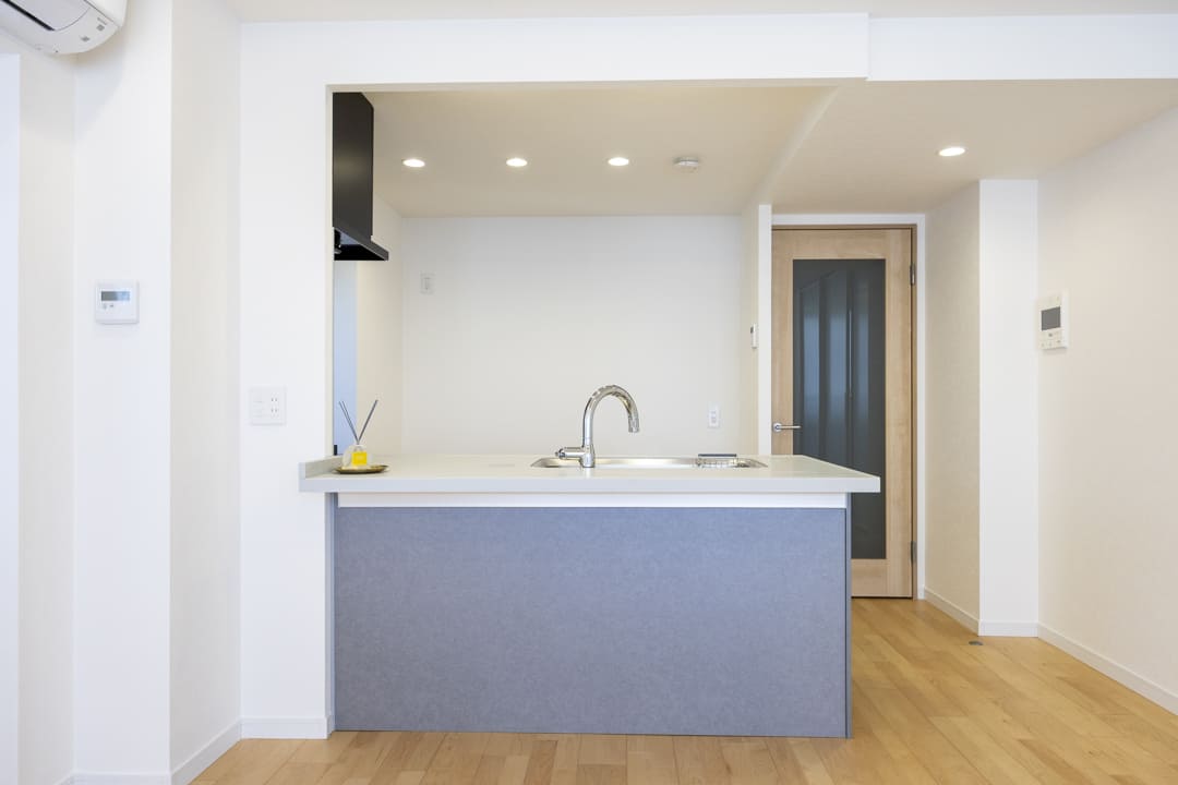 キッチンは、リビングダイニングを見渡しながら料理ができる対面式です。家族やゲストとのコミュニケーションが取りやすくて◎。しかし、コンロ側には壁がたっているので、油跳ねなどの心配はありません。また、サービスバルコニーにアクセスできる窓があります。