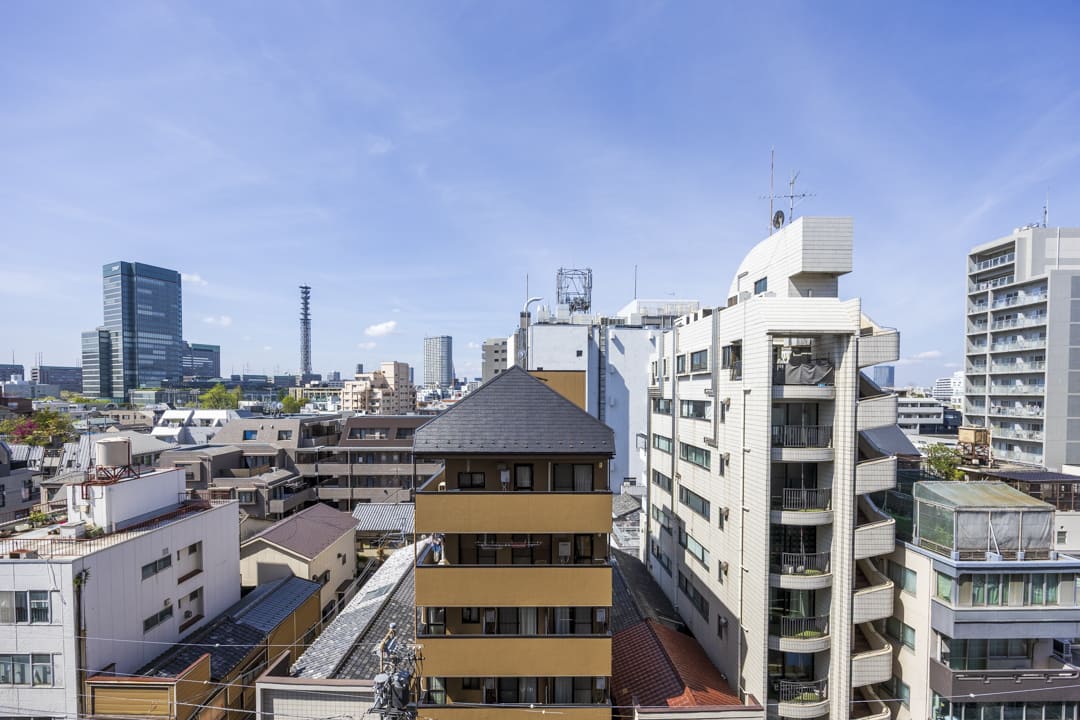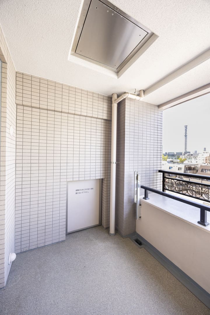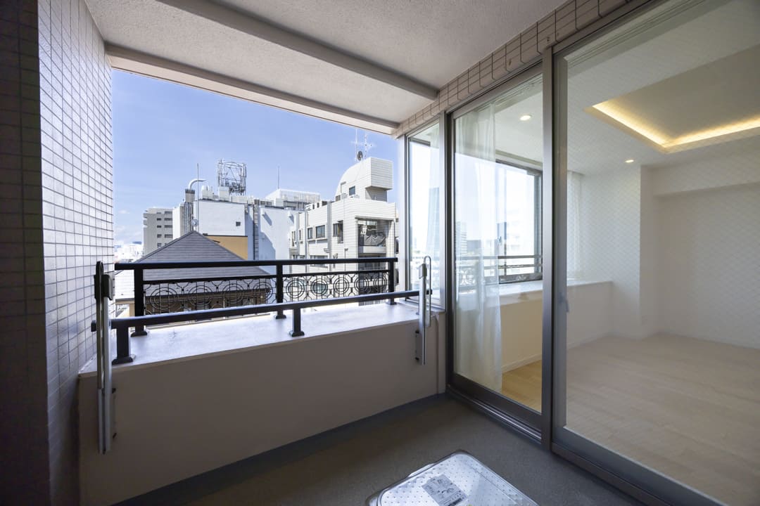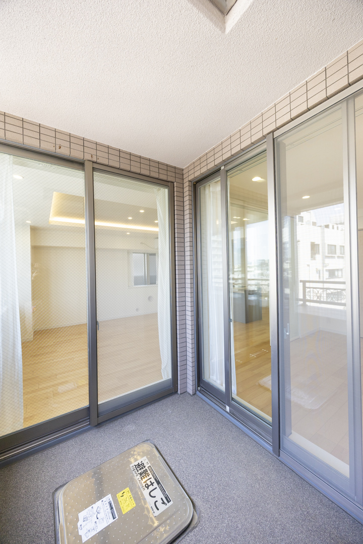 南西向きのバルコニーは約6.75㎡。寝室1とLDKから出入りができる便利な動線になっています。奥行きがあるタイプのため、チェアなどを置いてほっと一息つくこともできそうです。7階部分のため、目の前には抜け感のある眺望が広がり、日当たりも良好。